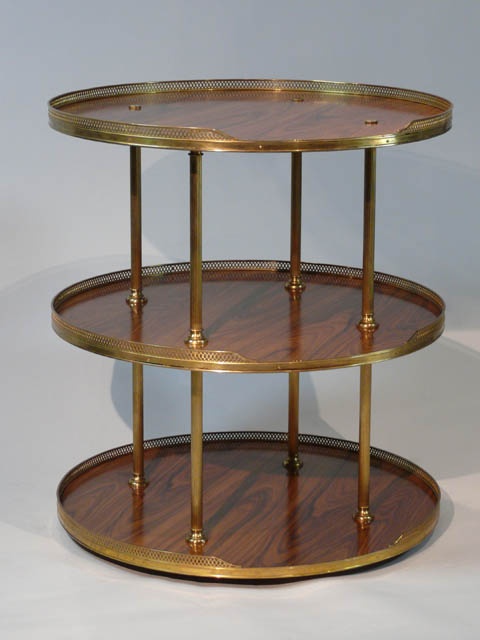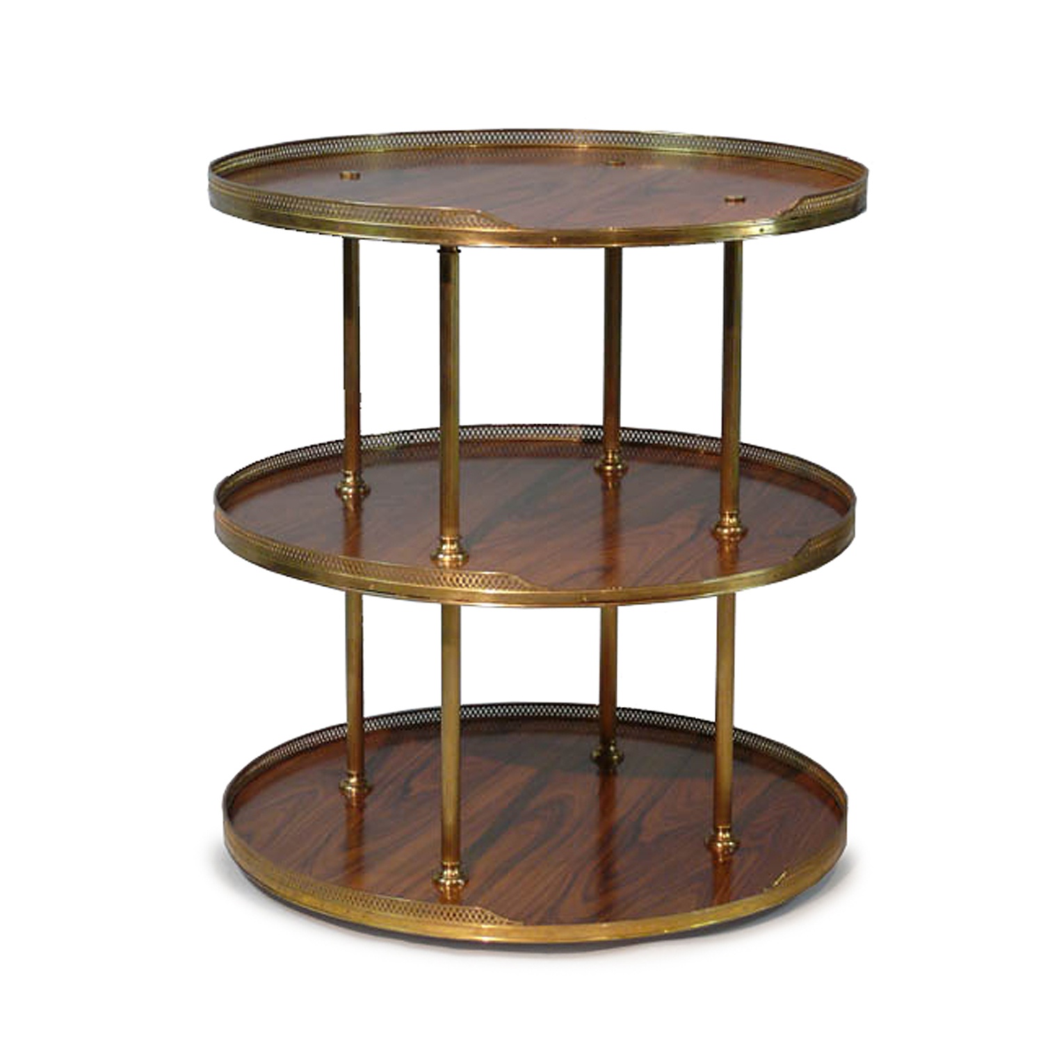 LOUIS XVI CIRCULAR THREE TIER ETAGER TABLE MAHOGANY WITH ORMOLU RIM AND COLUMN SUPPORTS 76 CM HIGH 69 CM DIAM (X2)