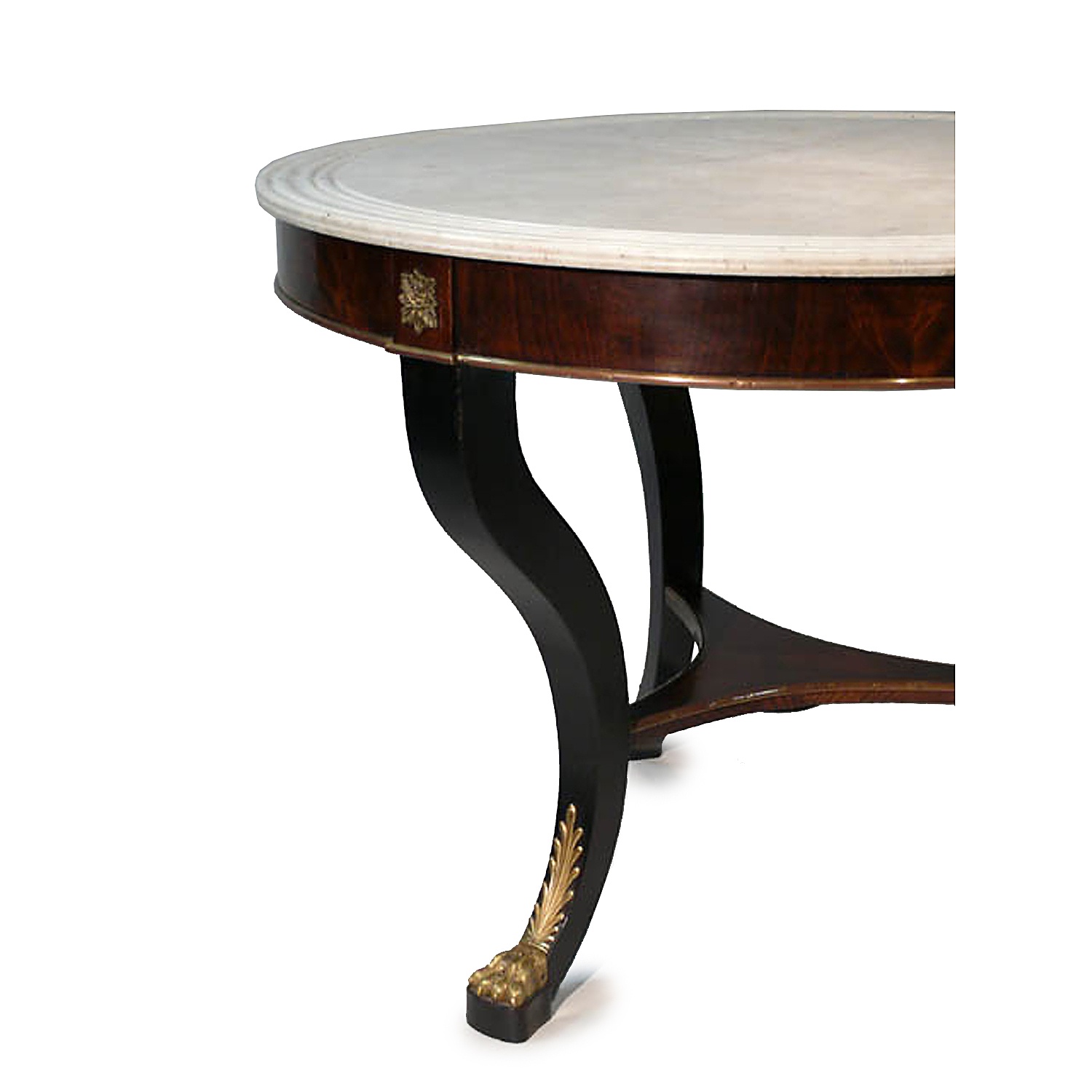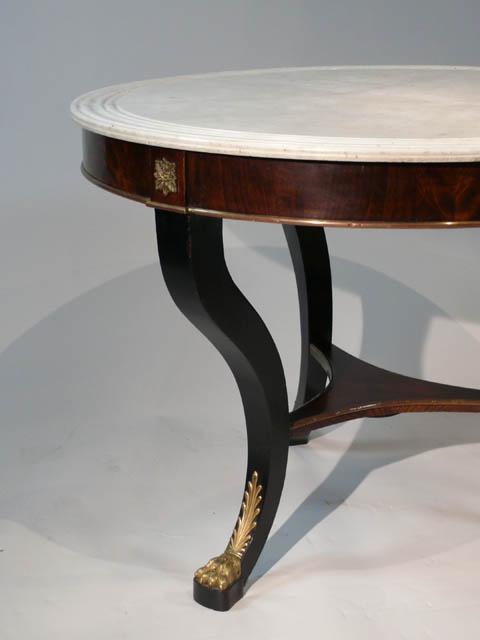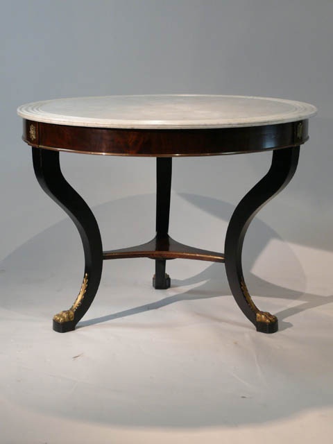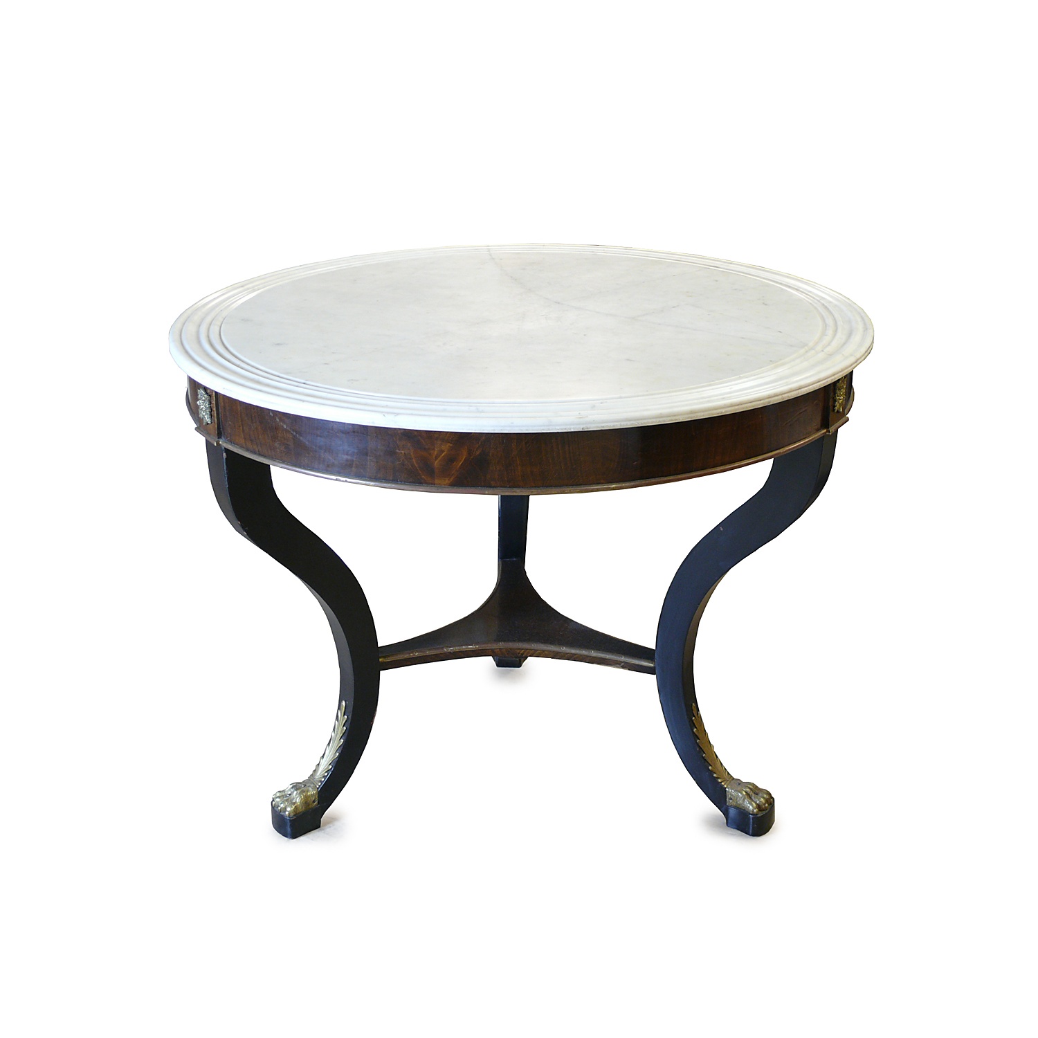 LOUIS XVI CIRCULAR WALNUT AND EBONY CENTRE TABLE WITH MOULDED WHITE MARBLE TOP ORMOLU MOUNTS ON SABRE LEGS 73 CM HIGH 106 CM DIAM