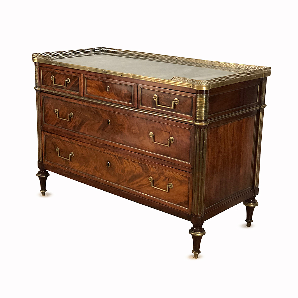 LOUIS XVI COMMODE MAHOGANY WITH ORMOLU MOUNTS GALLERY EDGE WITH A GREY SAINT ANN MARBLE TOP 88 CM HIGH 123 CM WIDE 58 CM DEEP