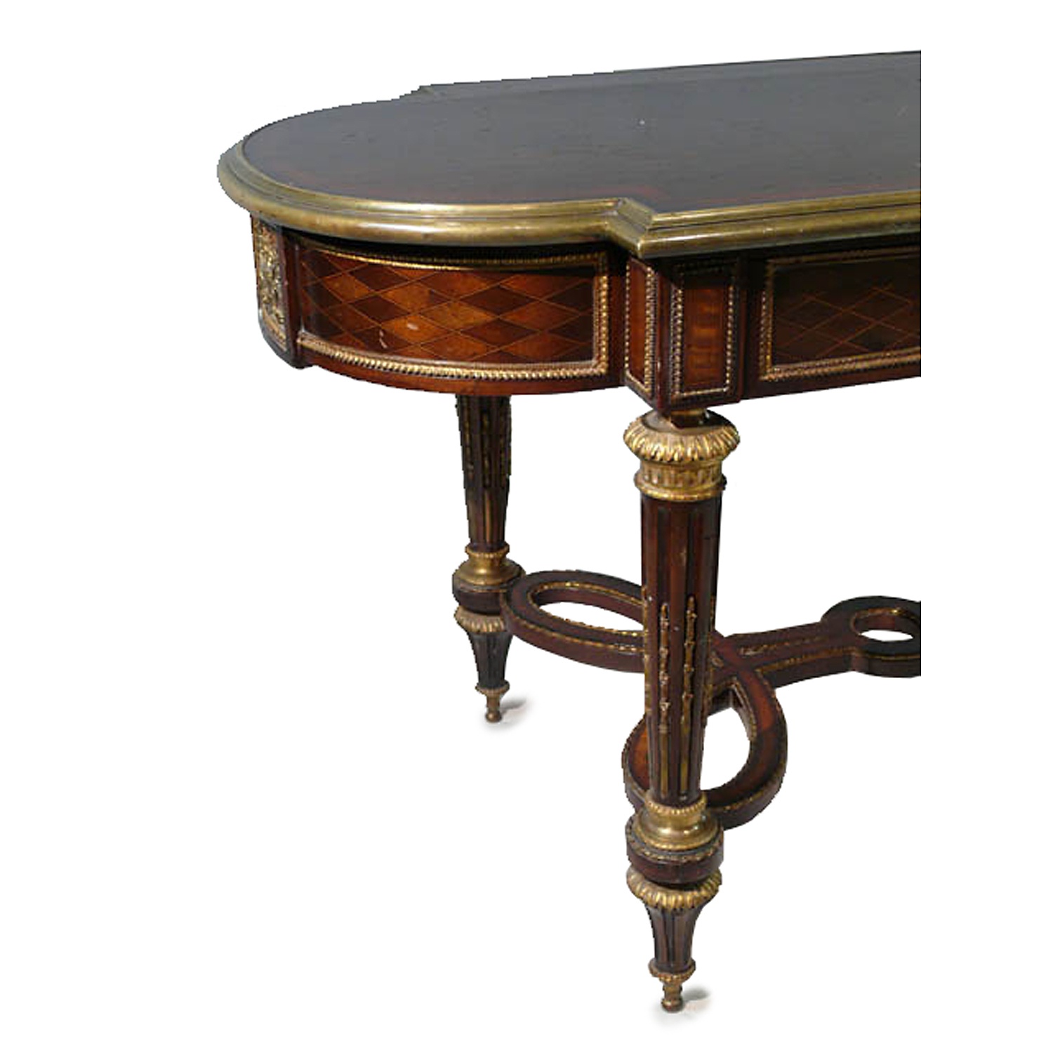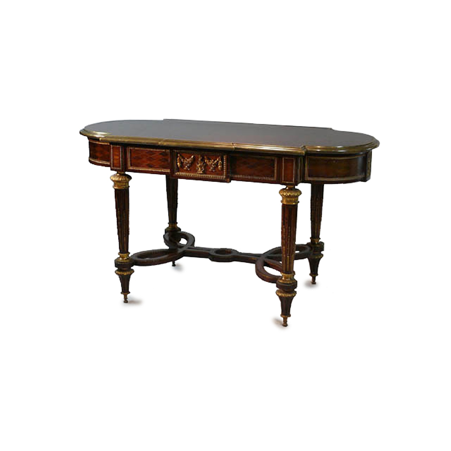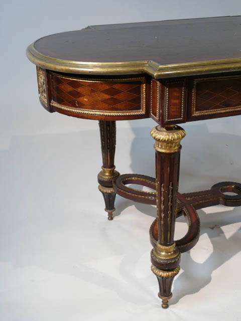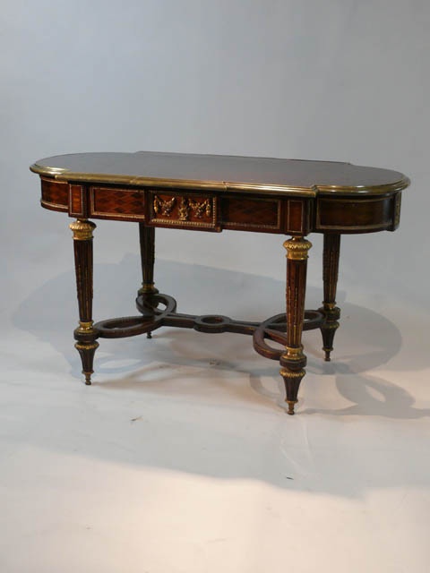 LOUIS XVI CRISS CROSS MARQUETRY D END CENTRE TABLE IN THE MANNER OF F LINKE 2'6/i HIGH 4'6/i LONG 2'3/i DEEP 76 CM X 137 CM X 68 CM