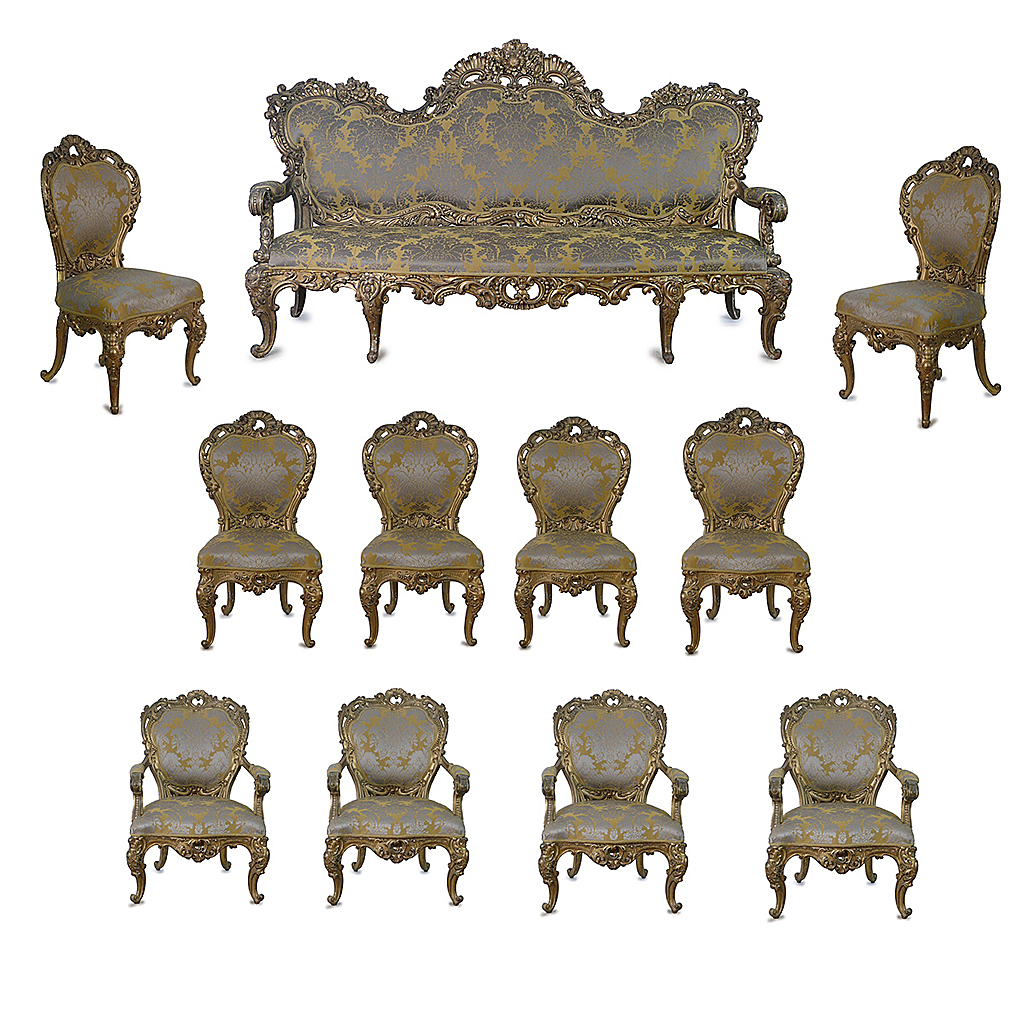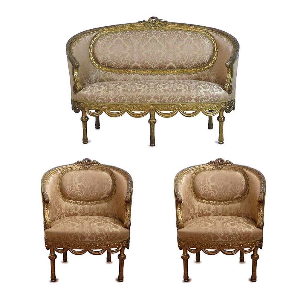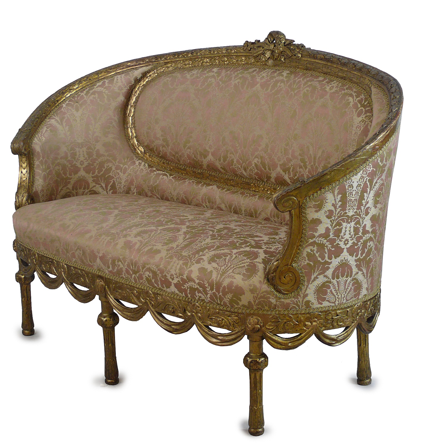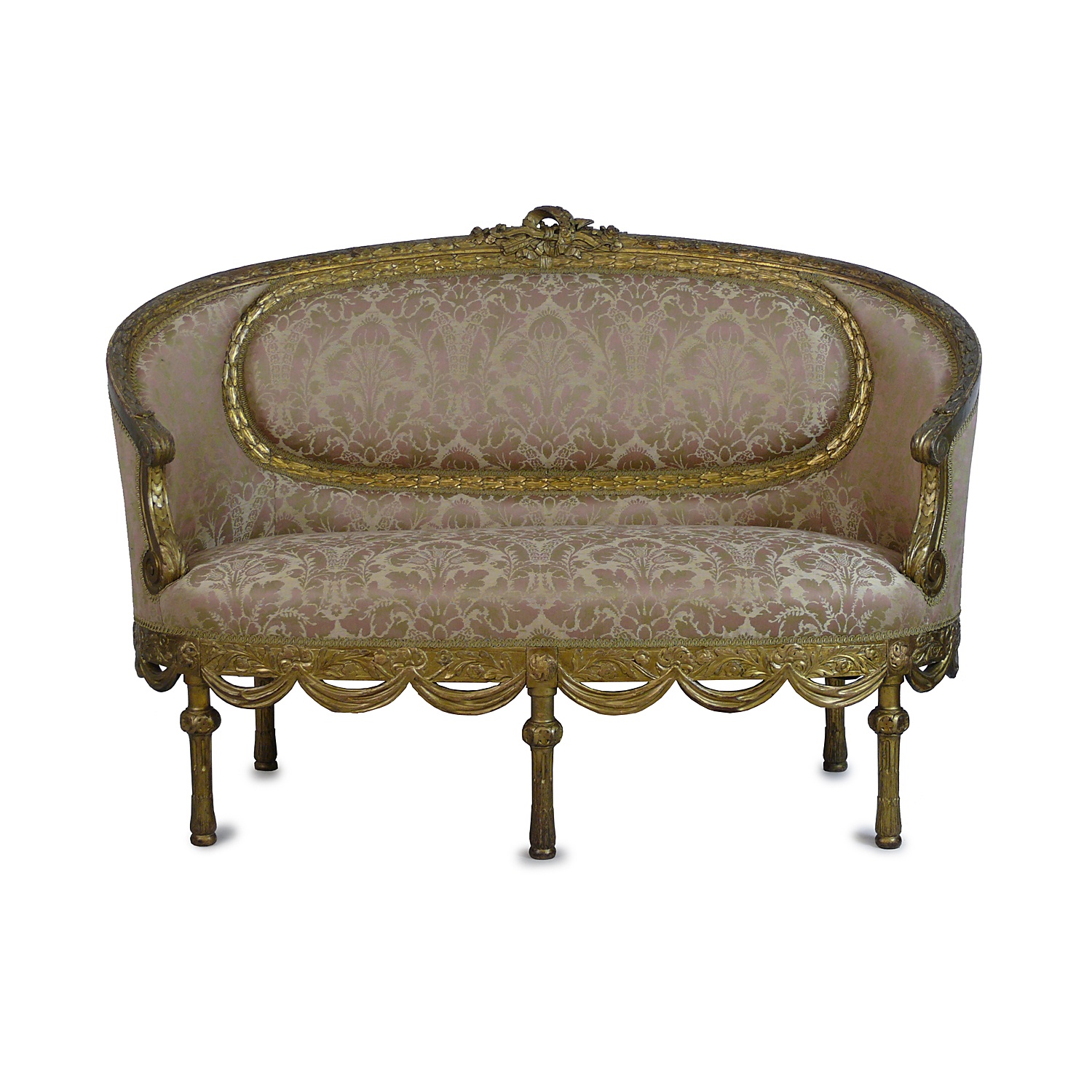 LOUIS XVI STYLE GILDED TWO SEAT SETTEE / SOFA SWAGGED FRAME OVAL BACK PALE PINK / GREEN DAMASK UPHOLSTERY 147 CM LONG