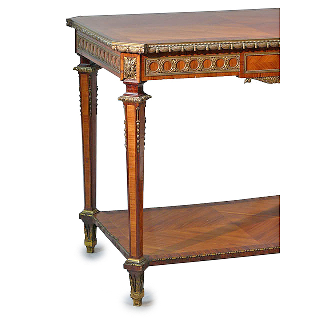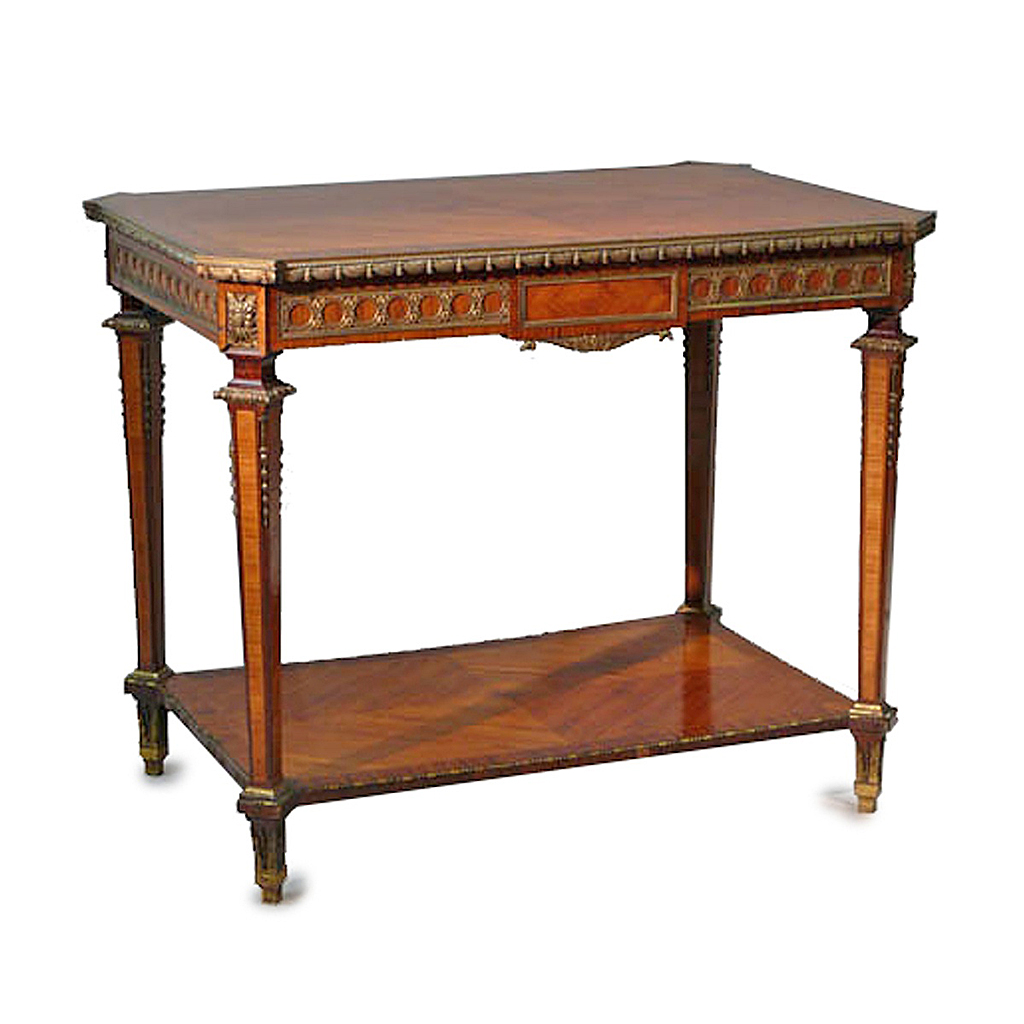 LOUIS XVI KINGWOOD CENTRE TABLE TWO TIER CANTED CORNERS AND ORMOLU MOUNTS 3' WIDE / 74 CM HIGH X 91 CM WIDE X 59 CM DEEP