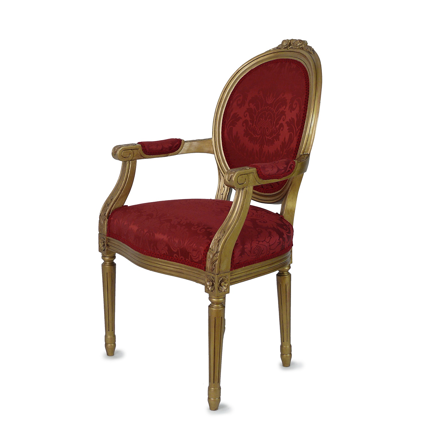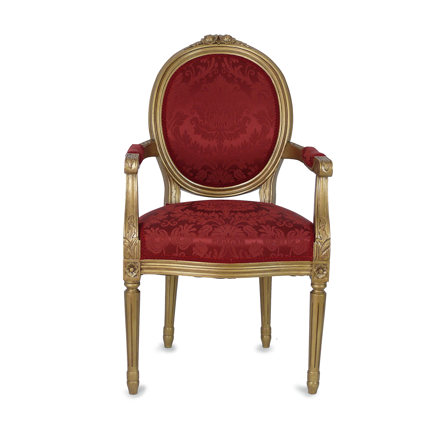 LOUIS XVI STYLE ELBOW CHAIR BANQUETING TYPE CARVED AND GILT WITH RED DAMASK UPHOLSTERY 105 CM HIGH 60 CM WIDE 48 CM DEEP (X8)