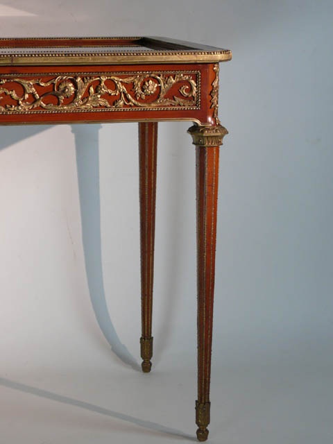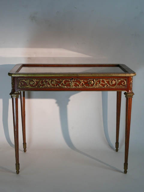 LOUIS XVI STYLE KINGWOOD AND ORMOLU VITRINE TABLE GLASS TOP DISPLAY CASE BLUE LINING AFTER FRANCOIS LINKE 2'8/i HIGH 3'2/i WIDE 1'11/i DEEP / 81 CM X 97 CM X 59 CM