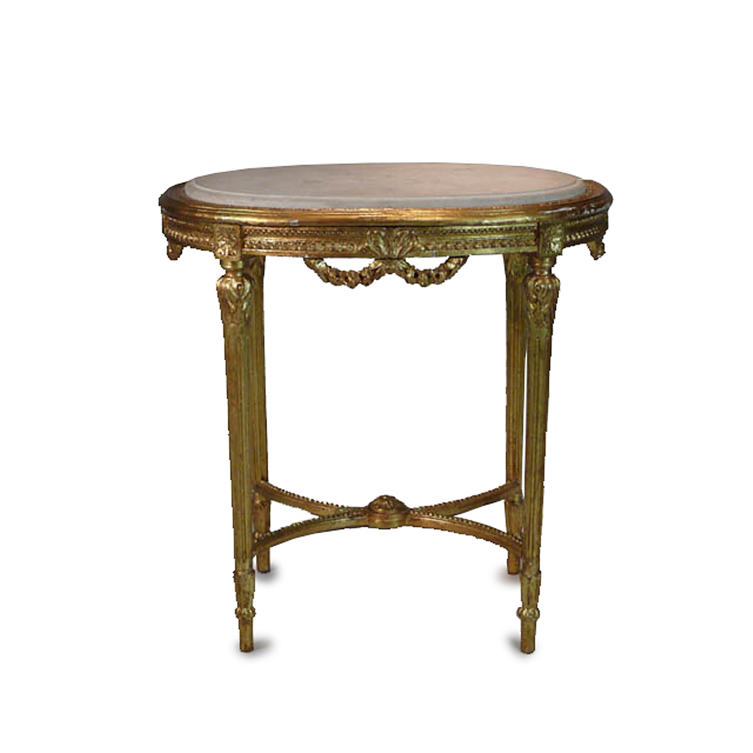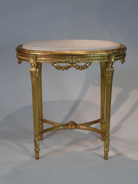 LOUIS XVI STYLE OVAL TABLE CARVED AND GILT WITH WHITE STONE / MARBLE TOP 74 CM WIDE 52 CM DEEP 75 CM HIGH