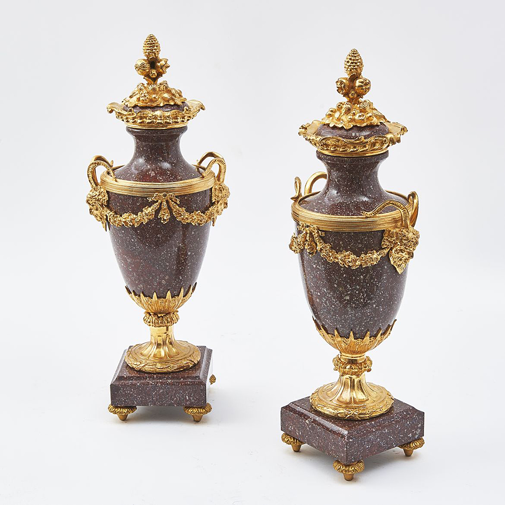 LOUIS XVI STYLE PINK PORPHYRY URN WITH LID SATYR MASK AND SWAG GARLAND MOUNTS AND PINEAPPLE FINIAL 41 CM HIGH 17 CM DIAM (X2)