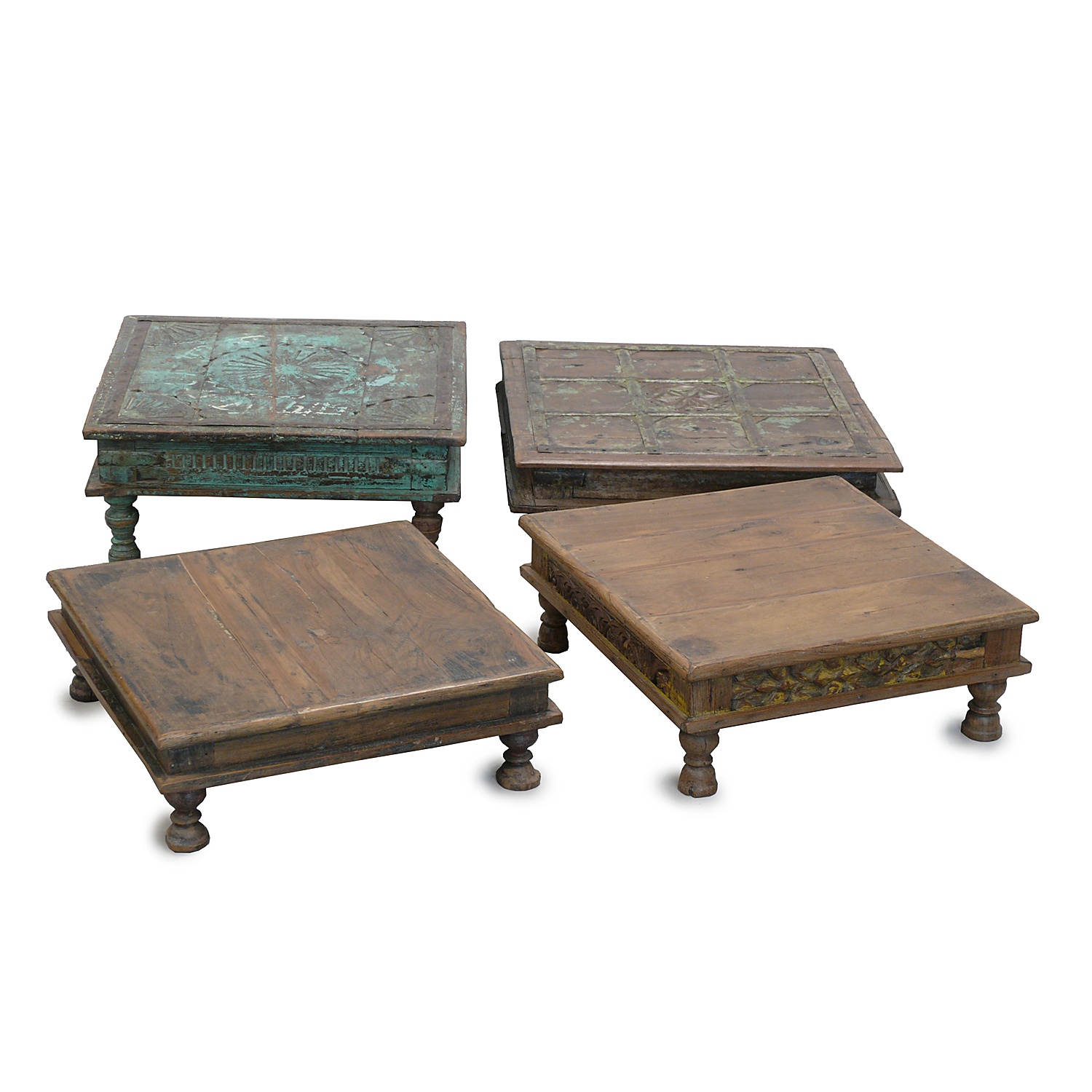 LOW INDIAN OCCASIONAL TABLE DARK WOOD WITH TURNED LEGS 1= 19 CM HIGH 54 CM WIDE 52 CM DEEP 1= 21 CM HIGH 43 CM WIDE 42 CM DEEP (X4)