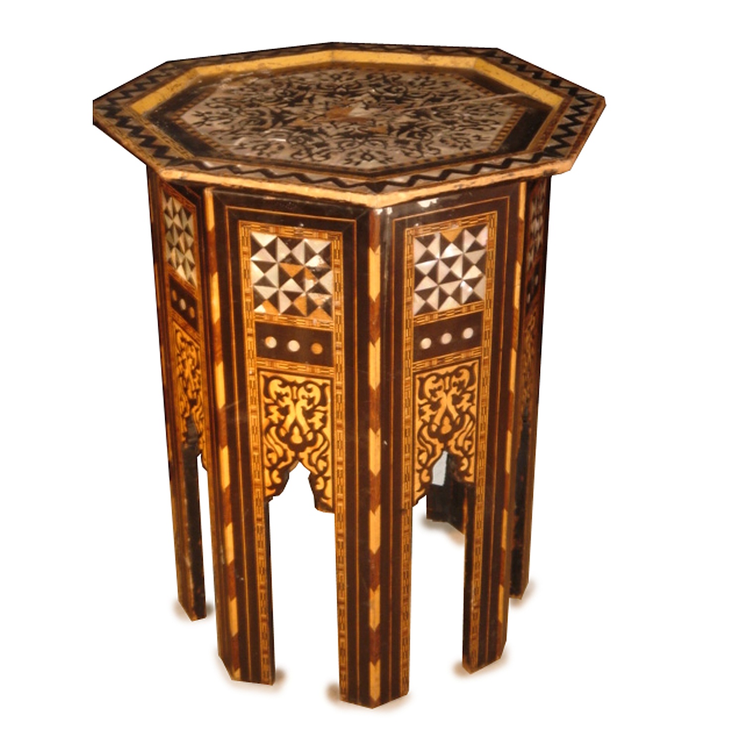 LOW MOTHER OF PEARL INLAID HEXAGONAL MOROCCAN TABLE 59 CM HIGH 48 CM WIDE 48 CM DEEP
