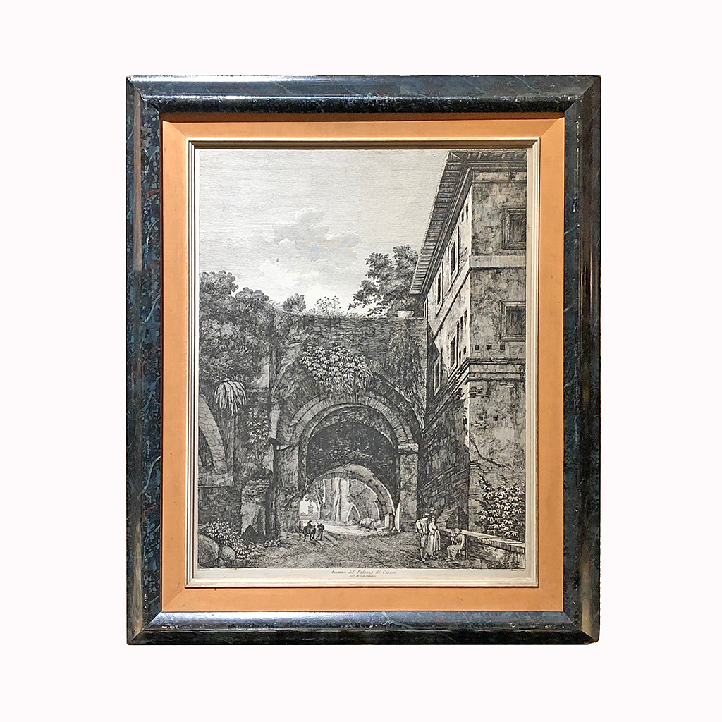 LUIGI ROSSINI ENGRAVING IN A BLUE FAUX MARBLE FRAME PALAZZO DI CASARI 47 CM X 36 CM