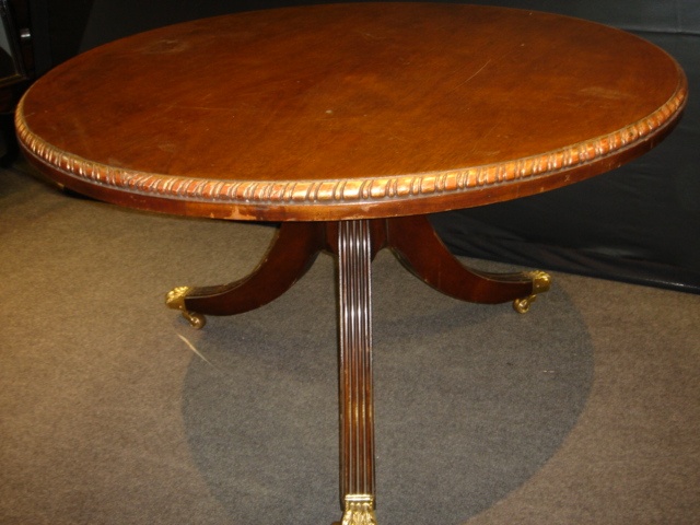 MAHOGANY CIRCULAR COFFEE TABLE WITH CARVED ROPE EDGE SABRE LEG BASE REGENCY STYLE 91 CM DIAM