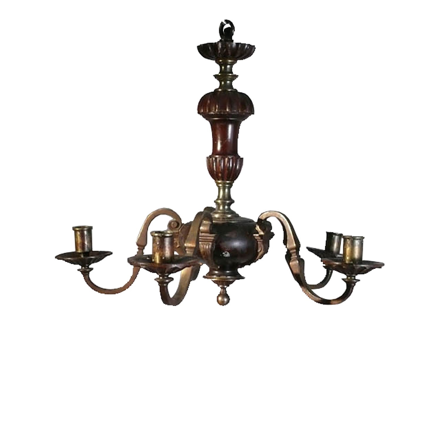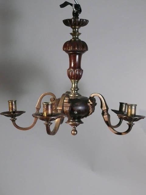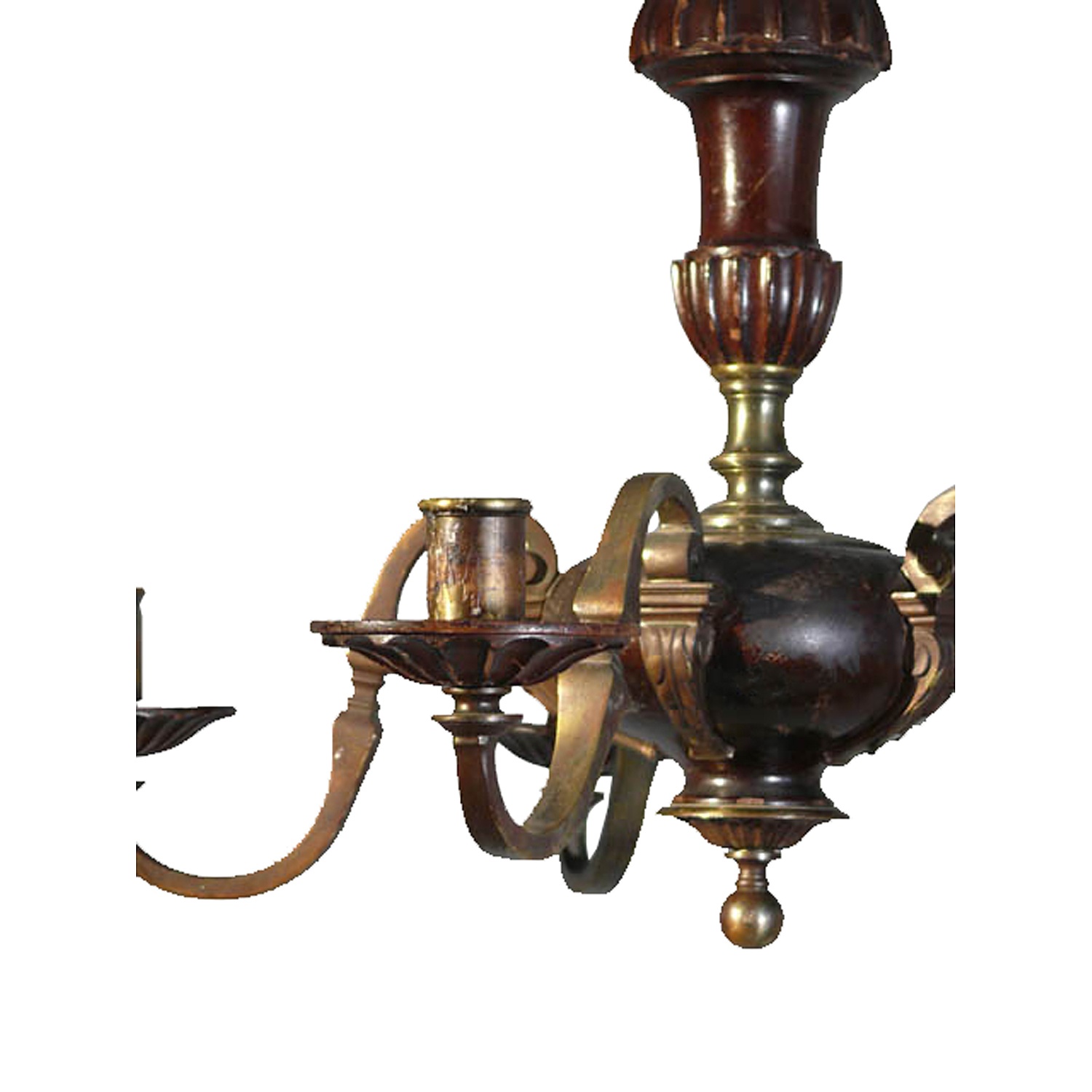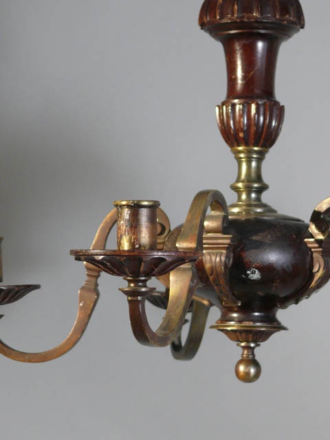 MAHOGANY AND BRASS FIVE BRANCH CHANDELIER ENGLISH 1'2/i WIDE 1'6/i HIGH 4.8 KG (X2)