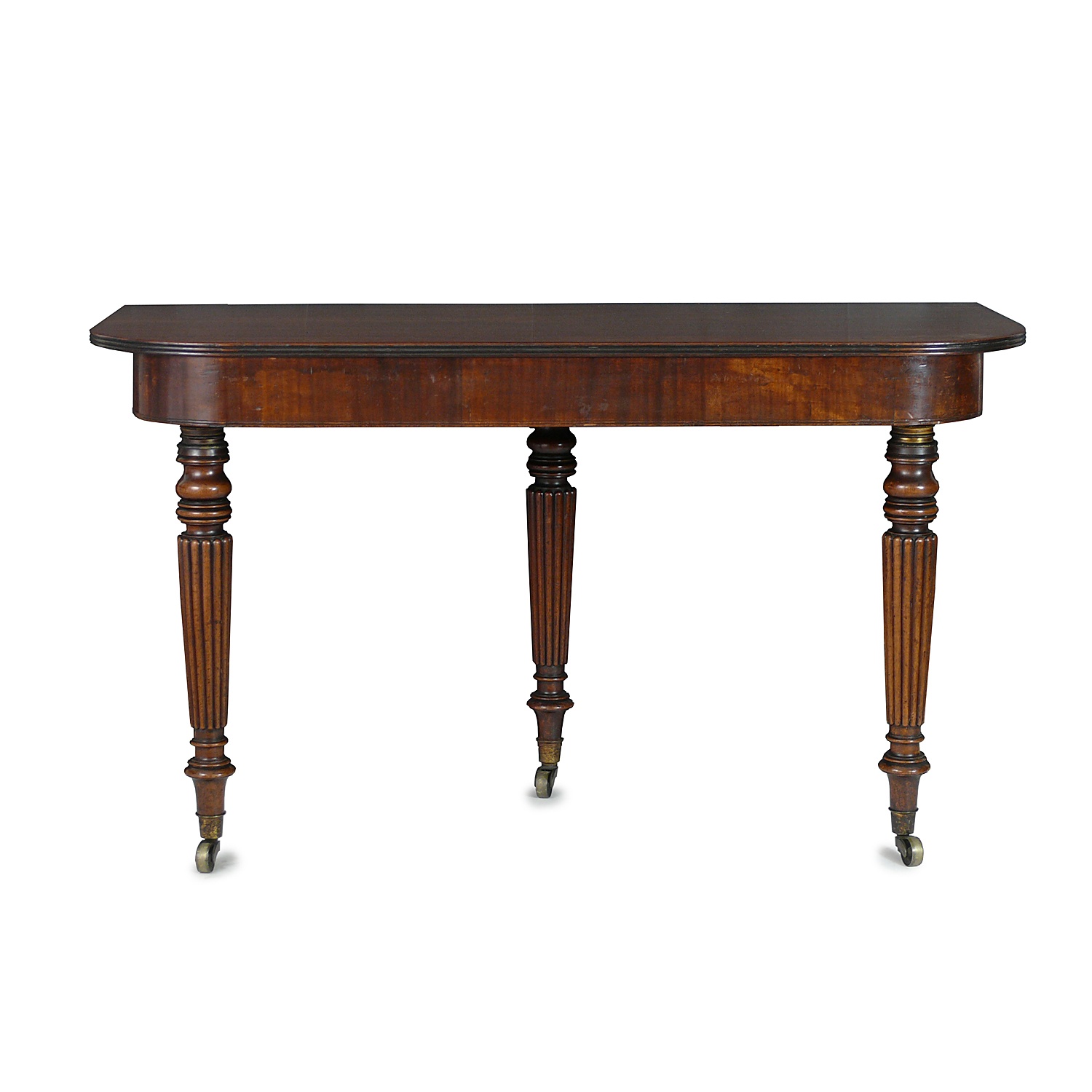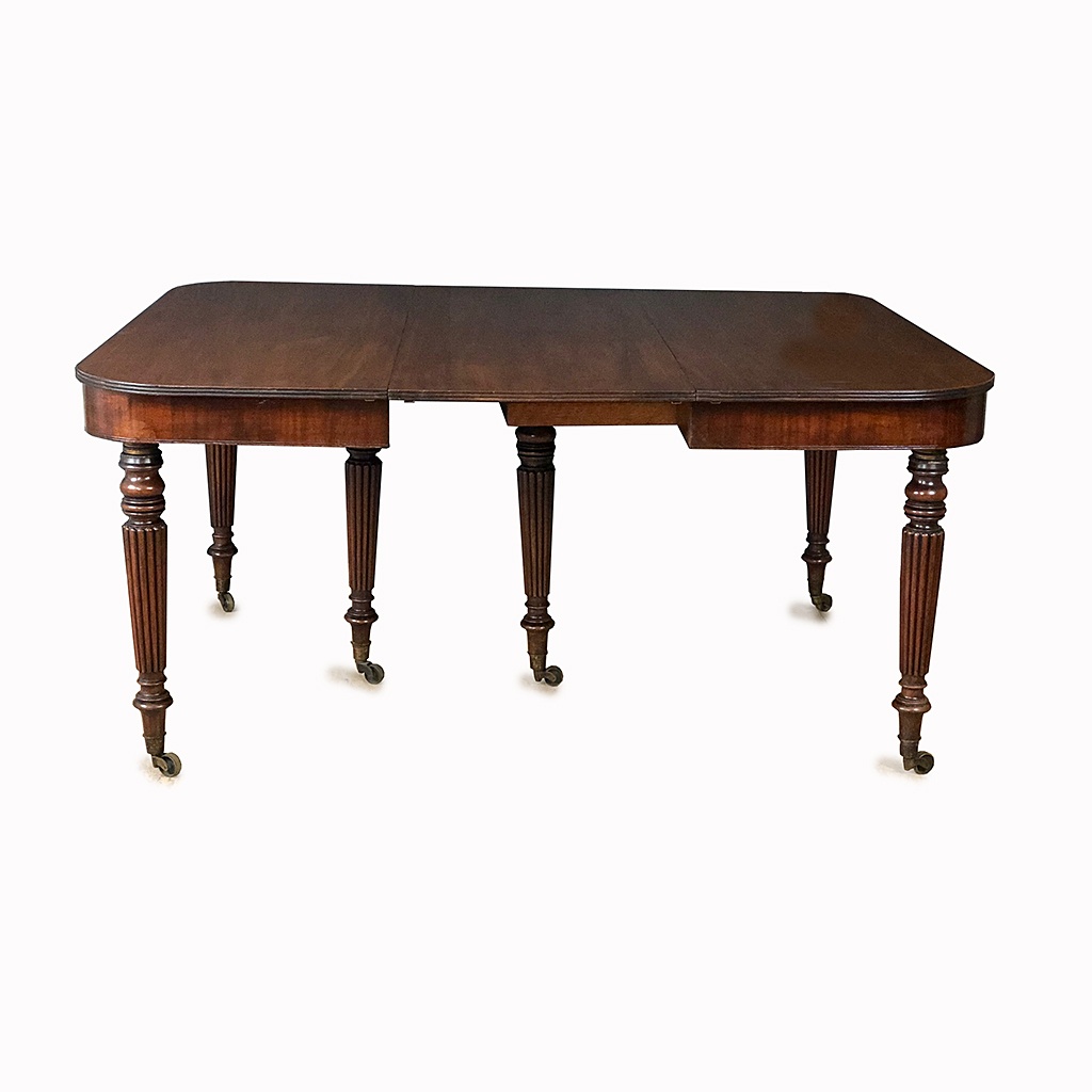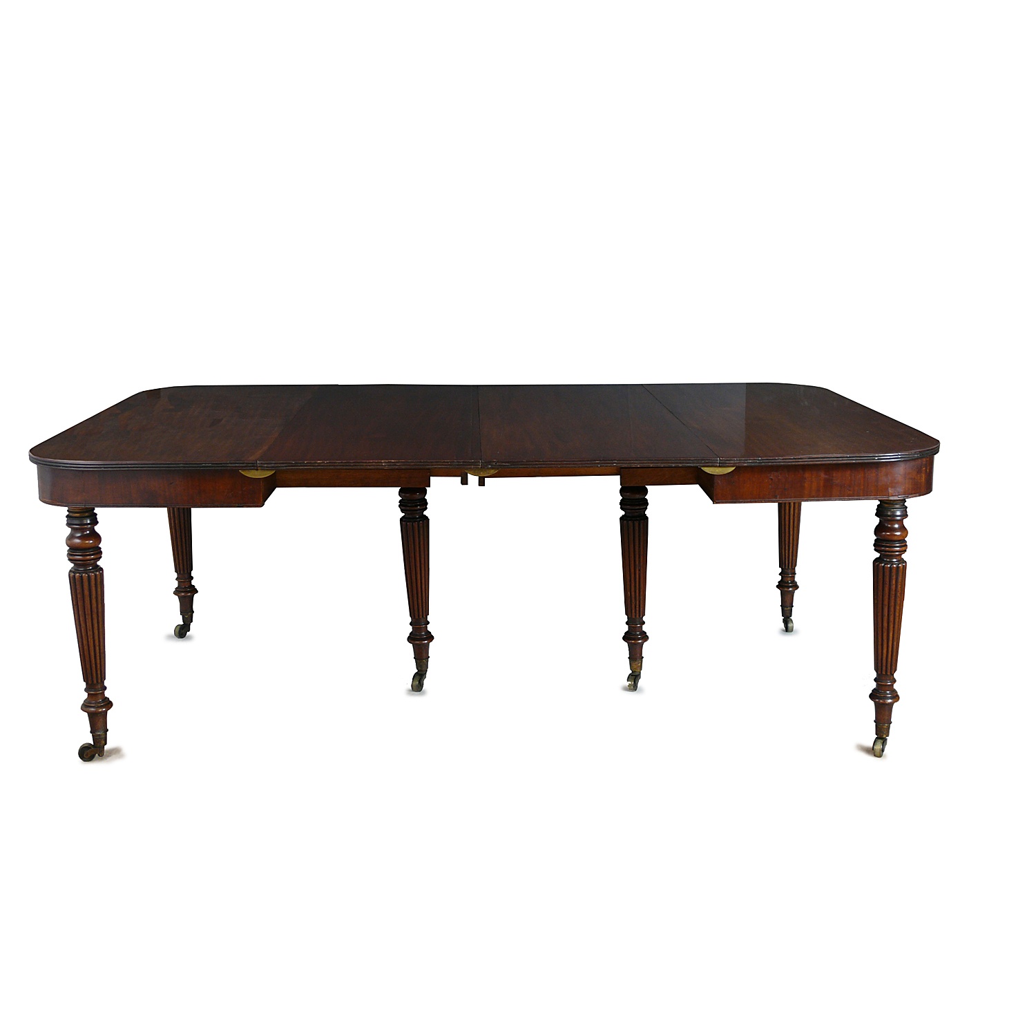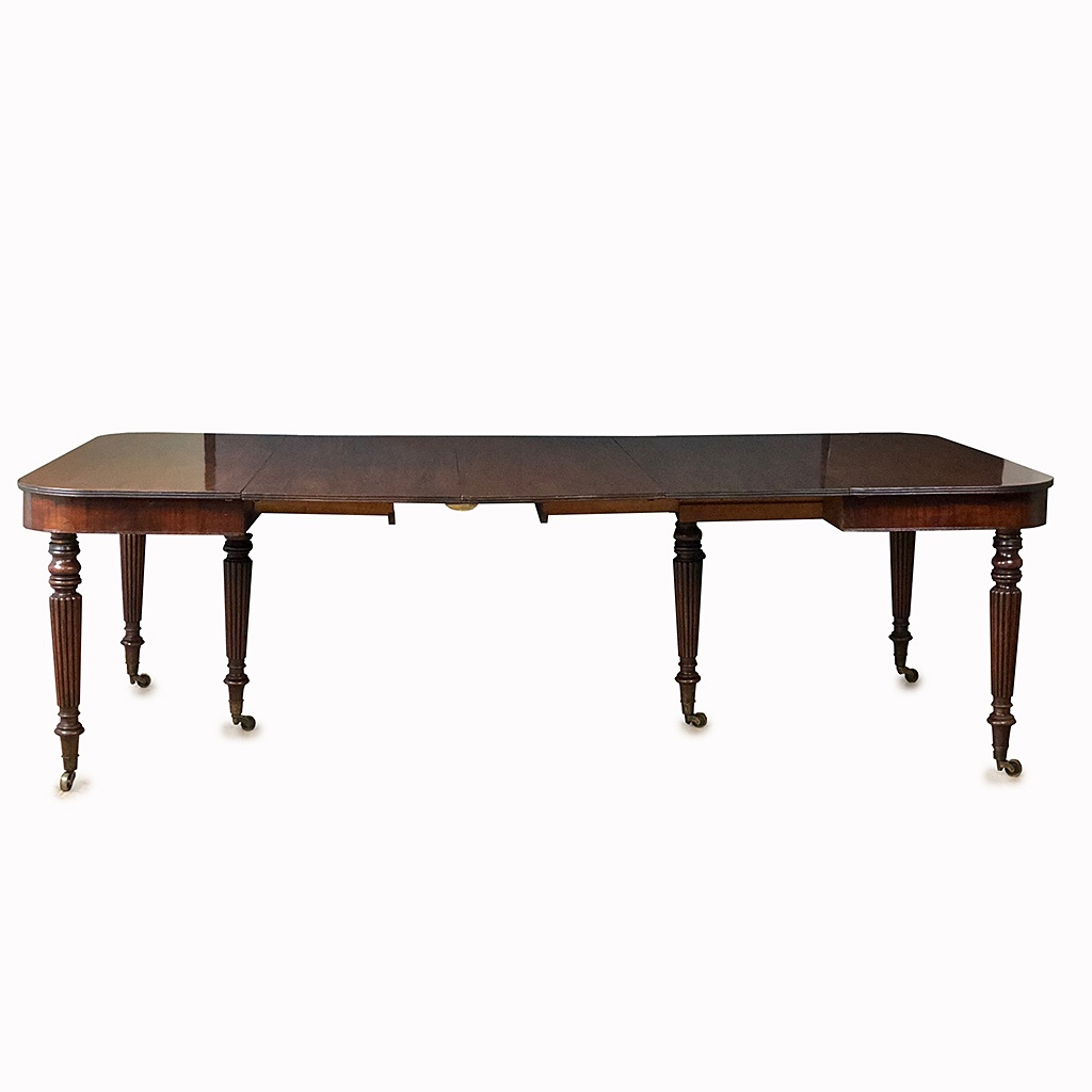 MAHOGANY EXTENDING DINING TABLE WITH THREE LEAVES FLUTED LEGS ON BRASS CASTORS WILLIAM IV CIRCA 1830 WILL CONVERT TO A PAIR OF SIDE TABLES 73 CM HIGH 245 CM LONG 129 CM WIDE