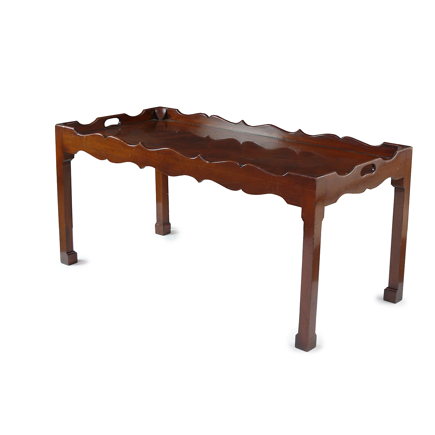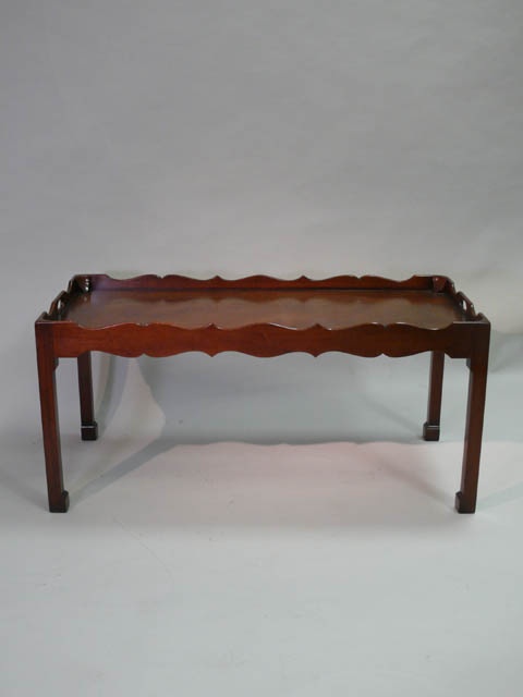 MAHOGANY OBLONG COFFEE TABLE WITH WAVE GALLERY EDGE 49 CM HIGH 106 CM LONG 50 CM DEEP (X4)