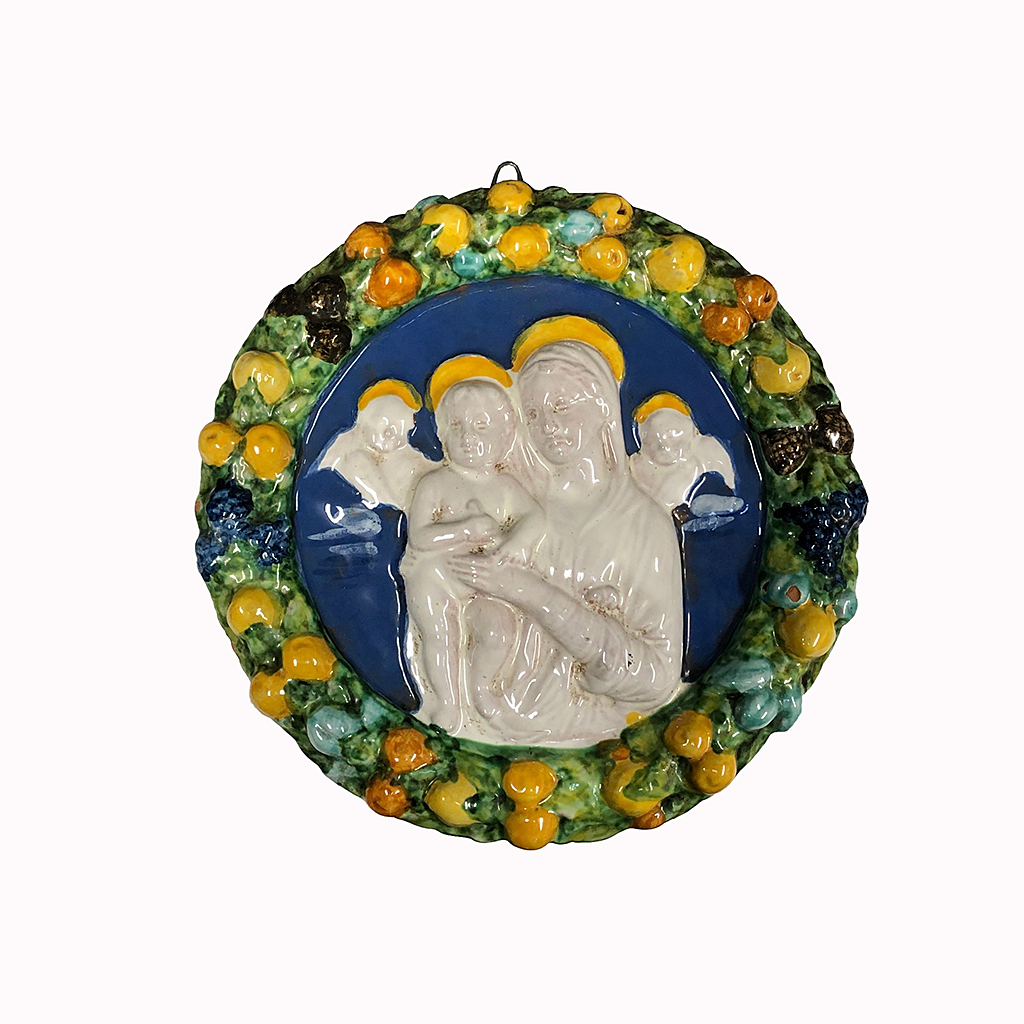 MAJOLICA CIRCULAR WALL PLAQUE MADONNA AND CHILD WITH FRUIT BORDER 23 CM DIAM