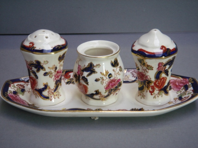 MASONS MANDALAY CONDIMENT SET ON STAND (INCL. SALT, PEPPER AND MUSTARD POT) PEONY FLOWER PAT. (X2)