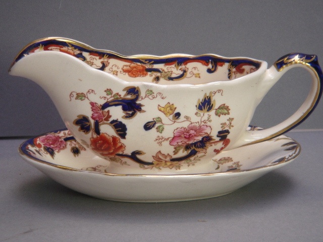 MASONS MANDALAY GRAVY BOAT AND STAND PEONY FLOWER PAT.
