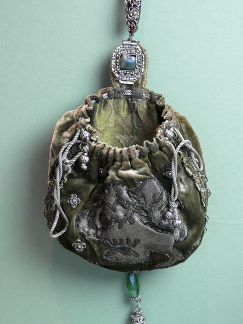 MEDIEVAL STYLE POUCH BAG GREEN AND PEWTER VELVET 20 CM HIGH