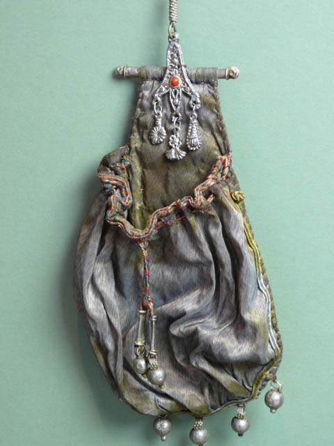 MEDIEVAL STYLE POUCH BAG GREEN SILK WITH SILVER MOUNT AND BEADS