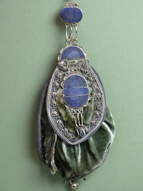 MEDIEVAL STYLE POUCH BAG OLIVE GREEN VELVET WITH BLUE LAPIS MOUNTS