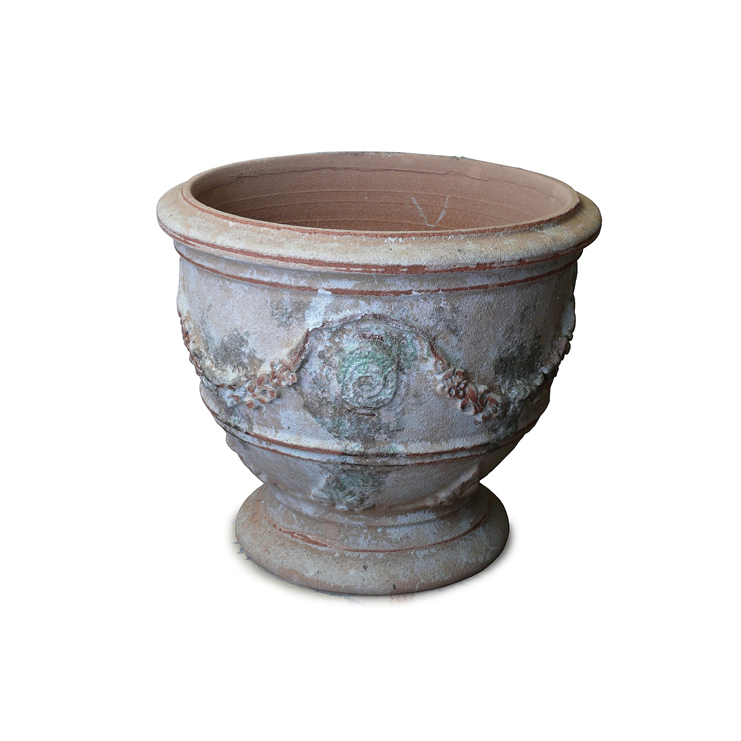 MEDIUM ANDUZ GARDEN URN / POT BOWL SHAPED ANTIQUED TERRACOTTA WITH SWAGS ON FOOTED BASE 54 CM HIGH 53 DIAM (X2)