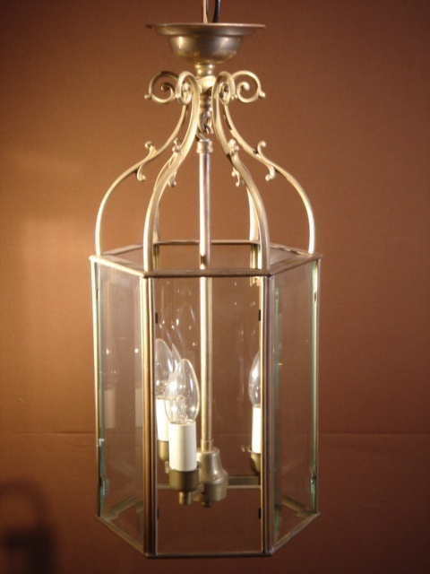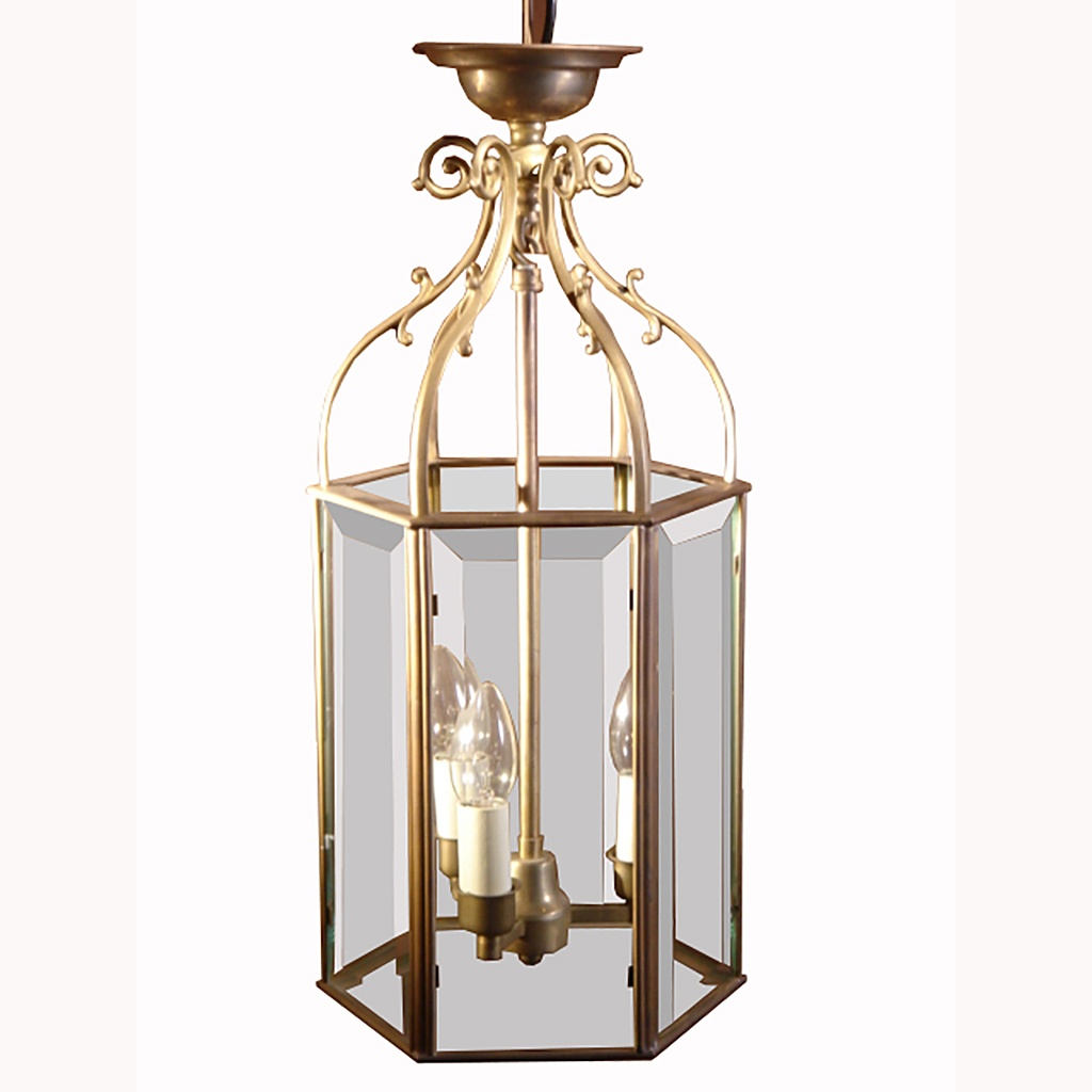 MEDIUM BRASS HEXAGONAL HALL LANTERN 22/i HIGH WITH BEVELLED GLASS PANELS (X7)