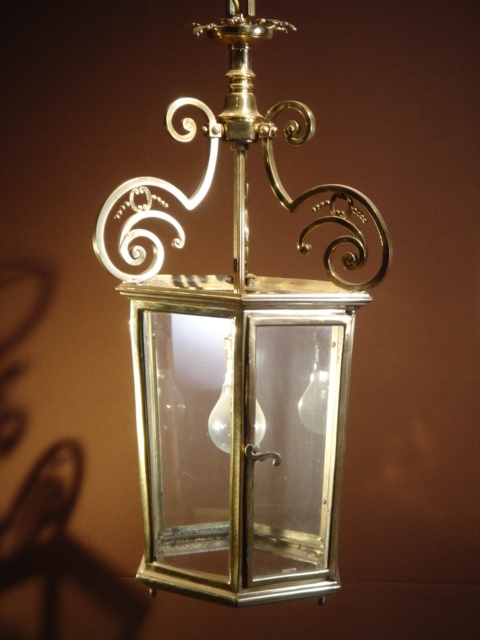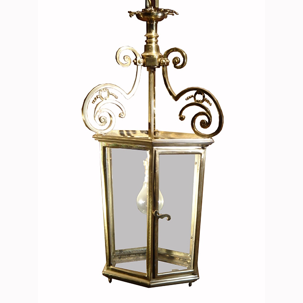 MEDIUM BRASS SIX SIDED HALL LANTERN WITH ORNATE SCROLL TOP