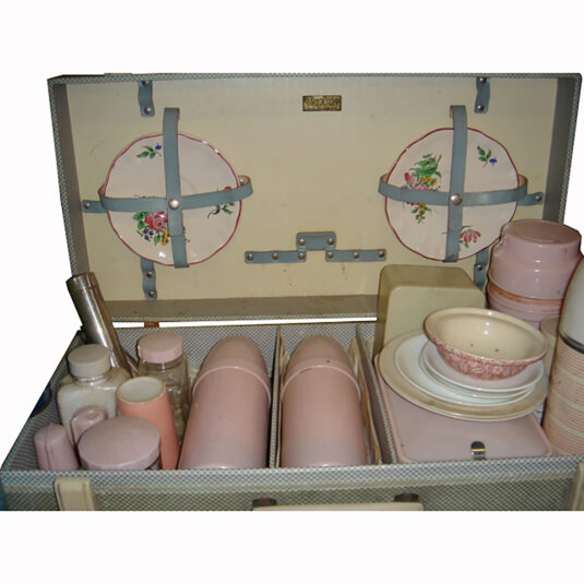 MEDIUM BREXTON FITTED CANE PICNIC HAMPER / BASKET COMPLETE WITH CONTENTS THERMOS, PLATES ETC.