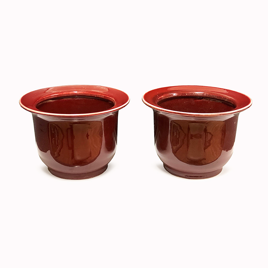 CHINESE SANG DE BOEUF BURGUNDY CHINA VASE CACHEPOT 15 CM HIGH 21 CM DIAM (X2)