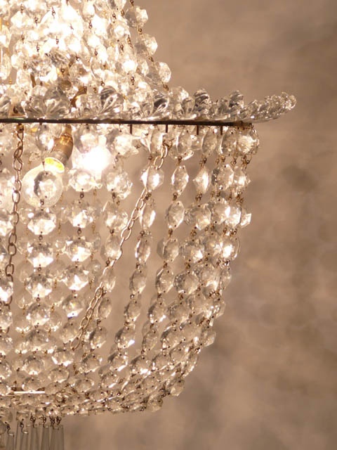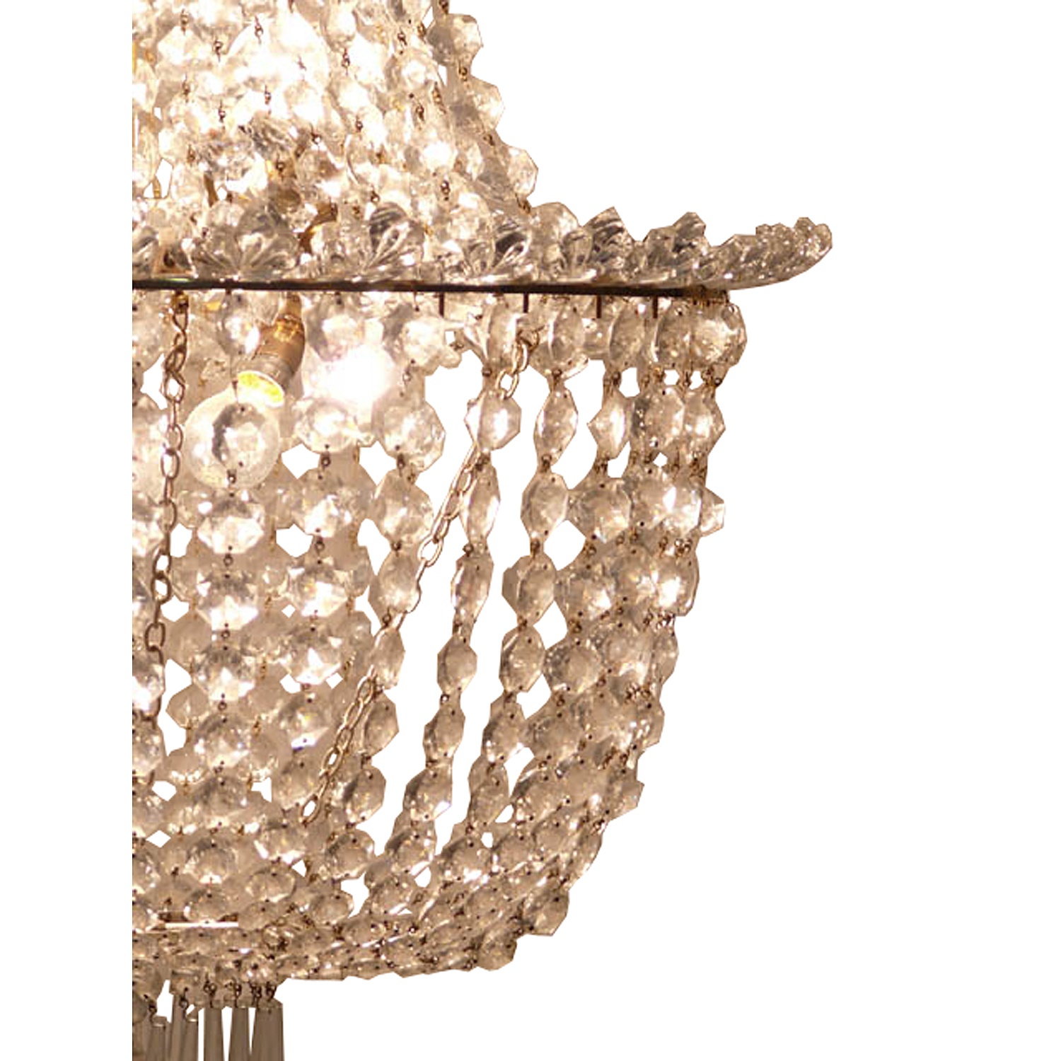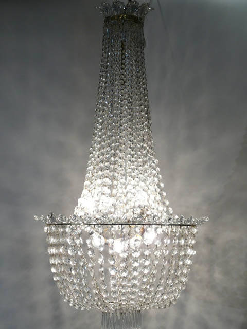 MEDIUM CRYSTAL BAG CHANDELIER 2'4/i DIAM 4'10/i HIGH 71 CM WIDE 147 CM HIGH WITH ACANTHUS LEAF RIM 39 KG (X2)