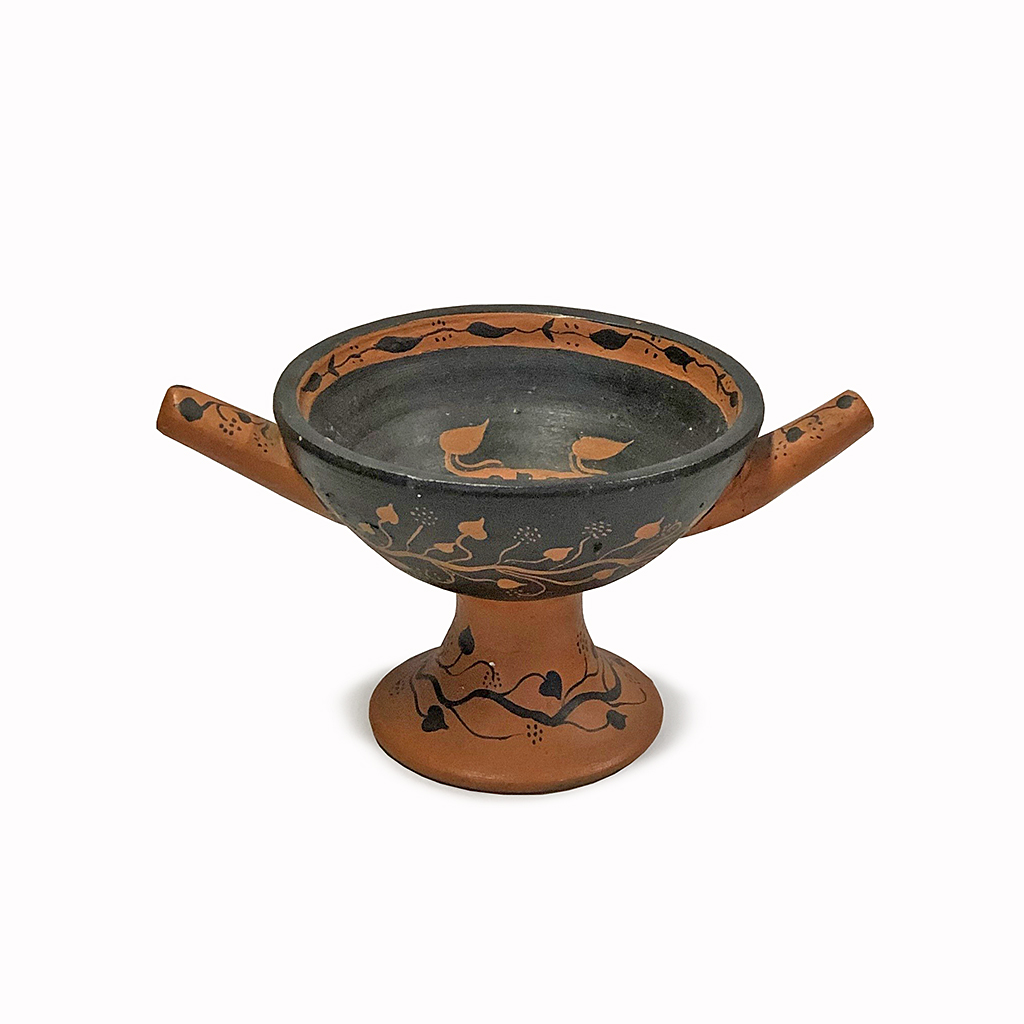 MEDIUM DECORATED GRECIAN BOWL / KYLIX CUP ON STEM WITH TWIN KNOB HANDLES 6" HIGH (X3)