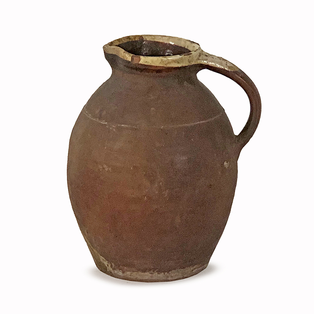 MEDIUM EARTHENWARE JUG WITH CREAM SLIP GLAZED HANDLE FRENCH 28 CM HIGH