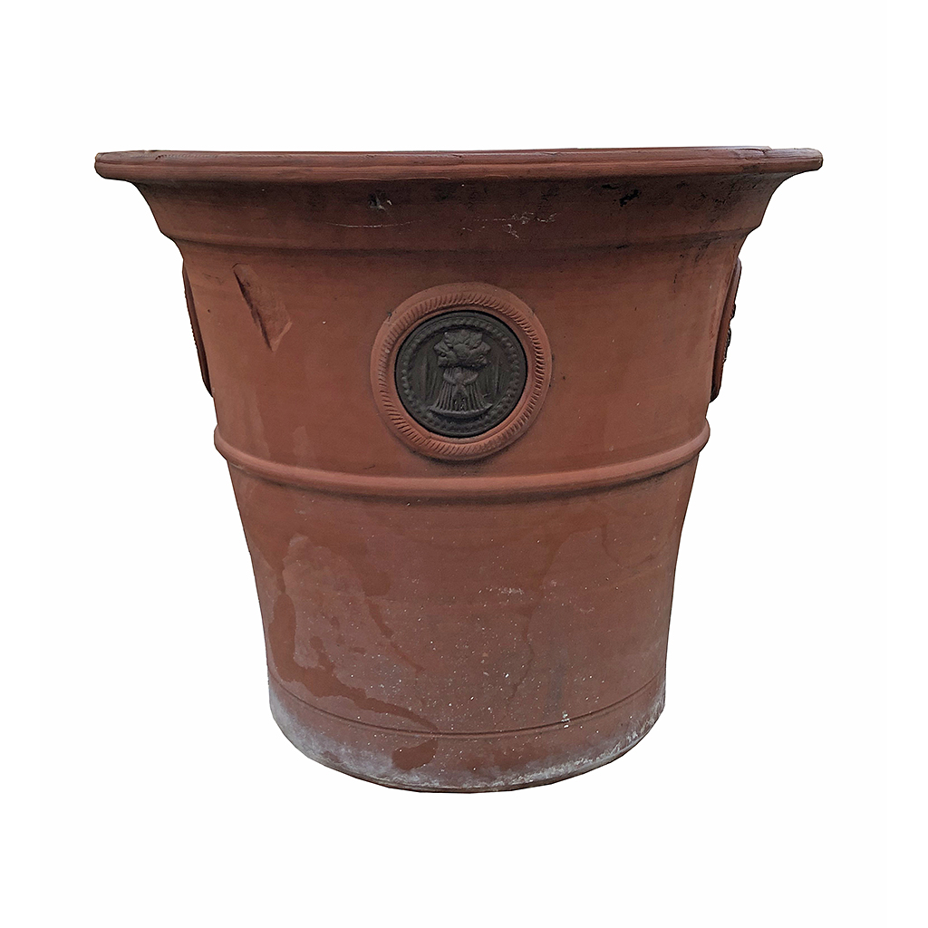 MEDIUM IRISH TERRACOTTA GARDEN URN DARK INSET MEDALLION