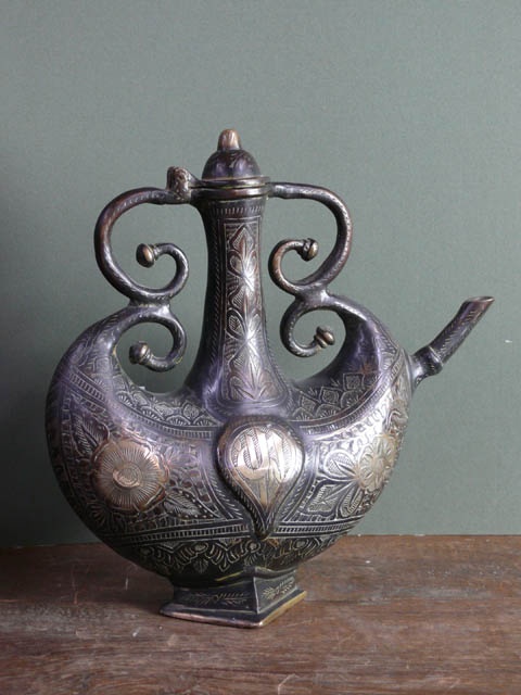MEDIUM MOGHUL ENGRAVED BRONZE CRESCENT SHAPED WATER JUG / VASE 11/i HIGH (X2)