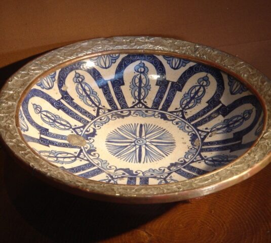 MEDIUM MOORISH BOWL 15 DIAMETER ORNATE BLUE AND WHITE PATTERN WITH A SILVER RIM