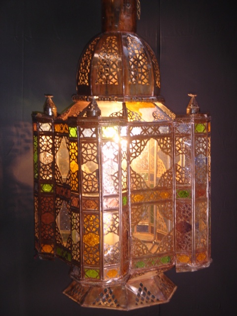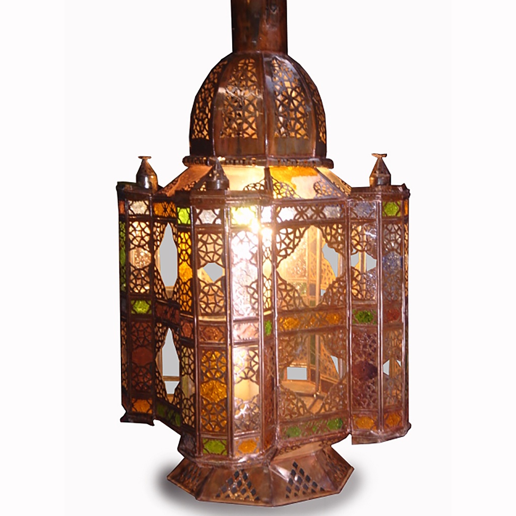 MEDIUM MOROCCAN SQUARE TIN LANTERN WITH BLUE COLOURED AND CLEAR GLASS PANELS 3' HIGH (X2)