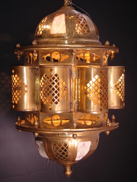 MEDIUM ORNATE BRASS OTTOMAN LANTERN WITH FRETTED SIDES DOME TOP BOTTOM AND OPAQUE WHITE GLASS 60 CM HIGH 41CM DIAM. (X2)