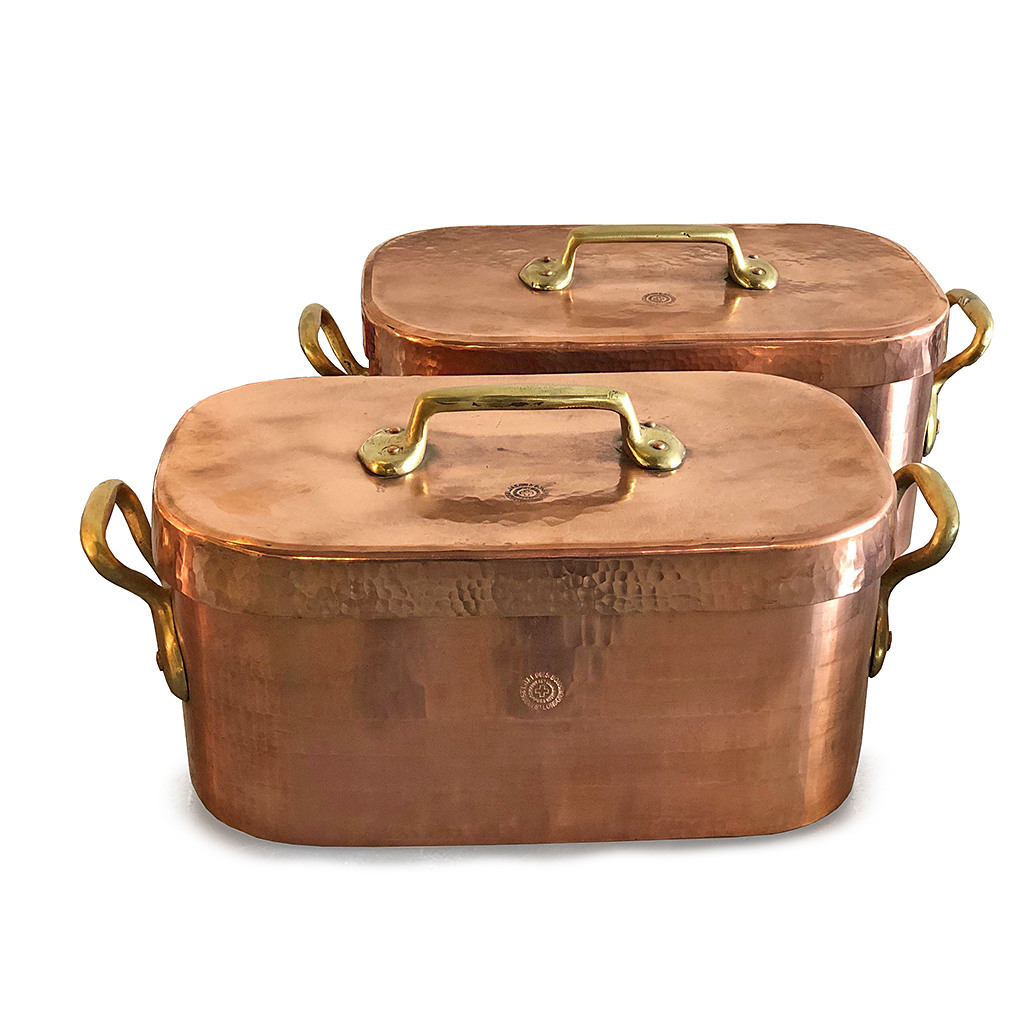 MEDIUM POLISHED COPPER BAKING SAUCEPAN AND LID RELINED L. JAEGGI AND SONS 17 CM HIGH 45 CM LONG 21 CM DEEP (X2)