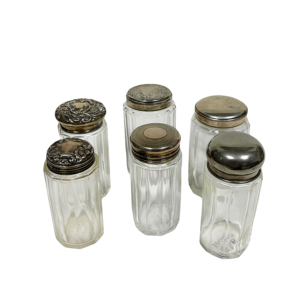 MEDIUM RIDGED GLASS TOILET BOTTLE WITH SILVER TOP AS LISTED 8 CM - 10 CM