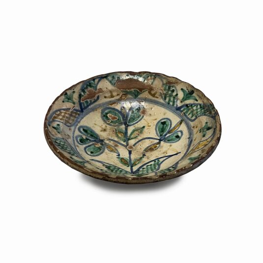 MEDIUM RUSTIC GLAZED SPANISH BOWL CREAM WITH GREEN FLORAL PATTERN 23 CM DIAM