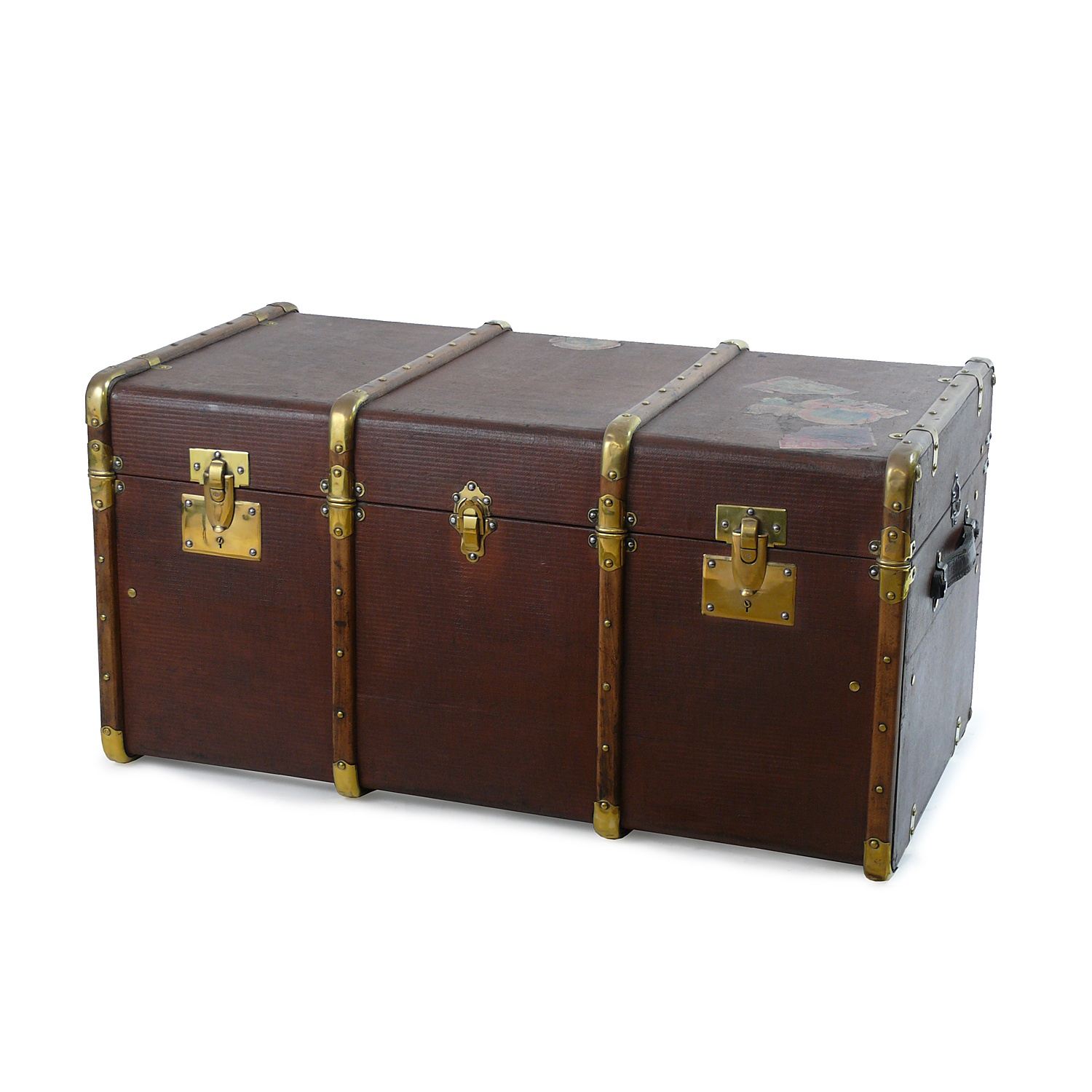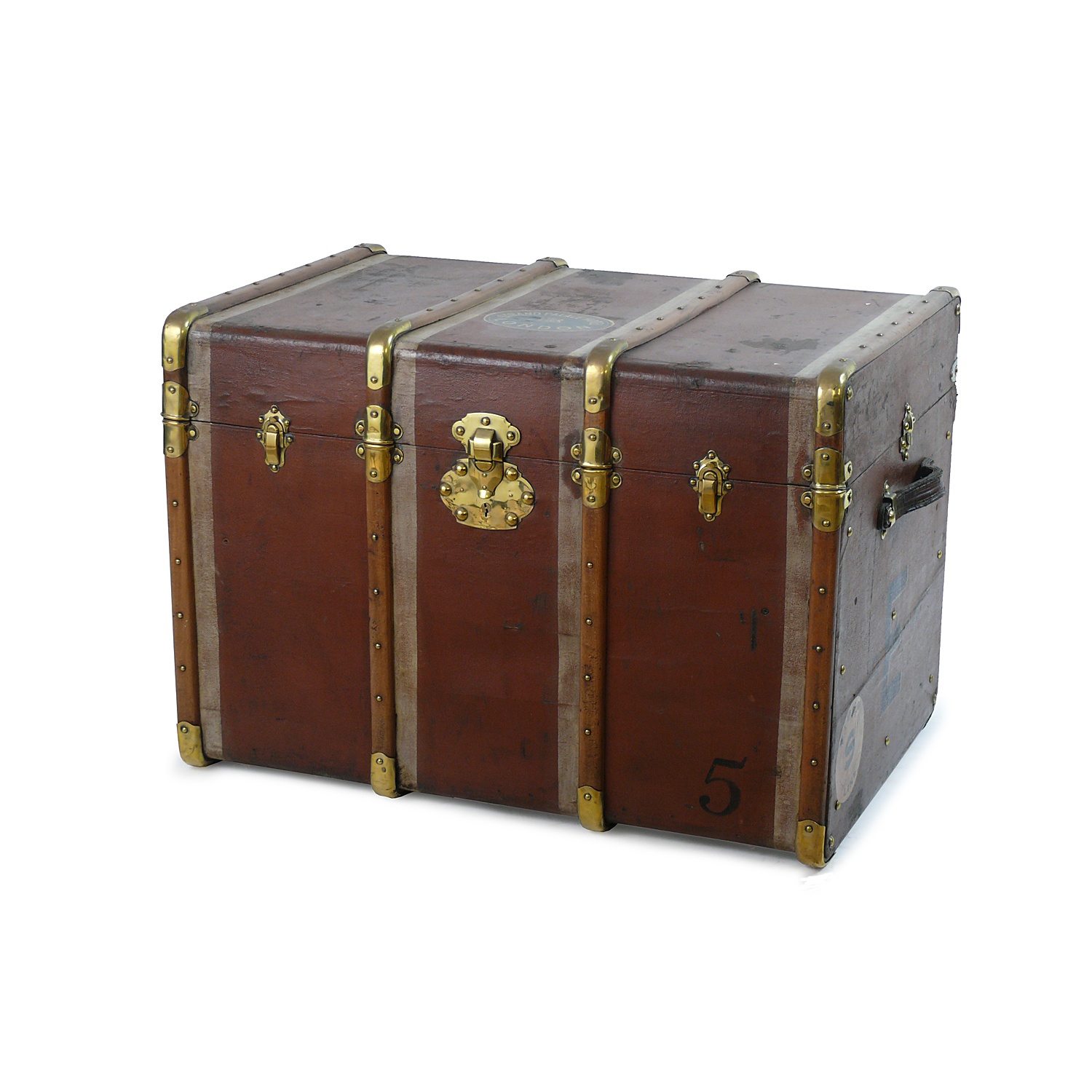 MEDIUM TAN FIBRE TRUNK WITH WOOD BINDING AND BRASS LOCKS AS SELECTED 79 - 89 CM WIDE