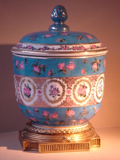 MEDIUM TURQUOISE SEVRE CHINA VASE AND LID PINK ROSE DESIGN 10/i HIGH (X2)