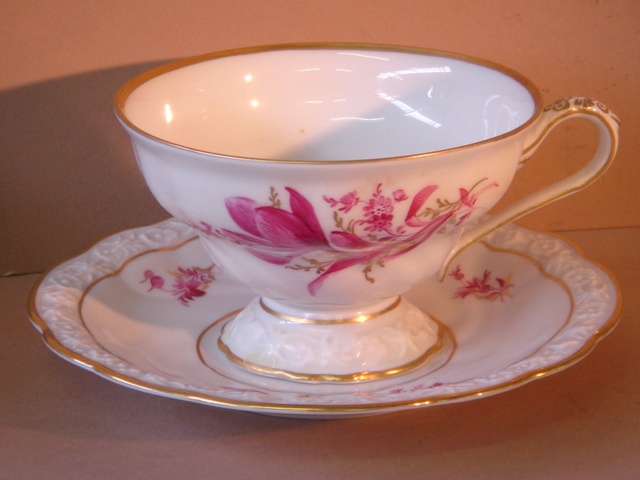 MEISSEN PINK AND WHITE FLORAL TEACUP AND SAUCER (X6)
