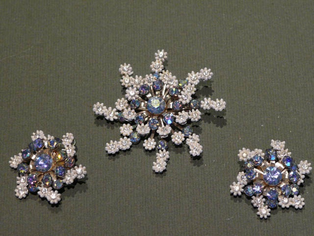 METAL BROOCH WITH SMALL WHITE FLOWERS AND BLUE PASTE WITH MATCHING EARRINGS