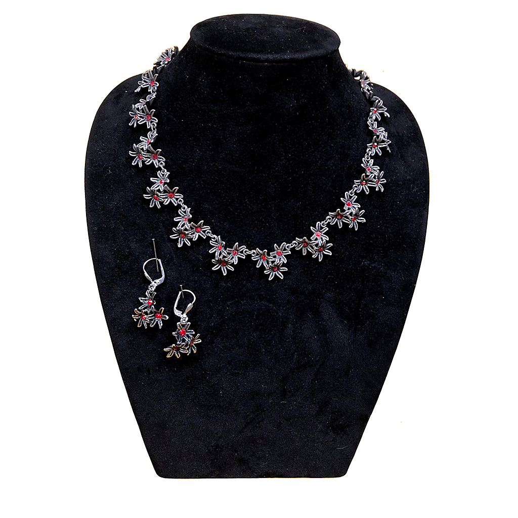 METAL FLOWER WITH RED PASTE CENTRES AND MATCHING EARRINGS