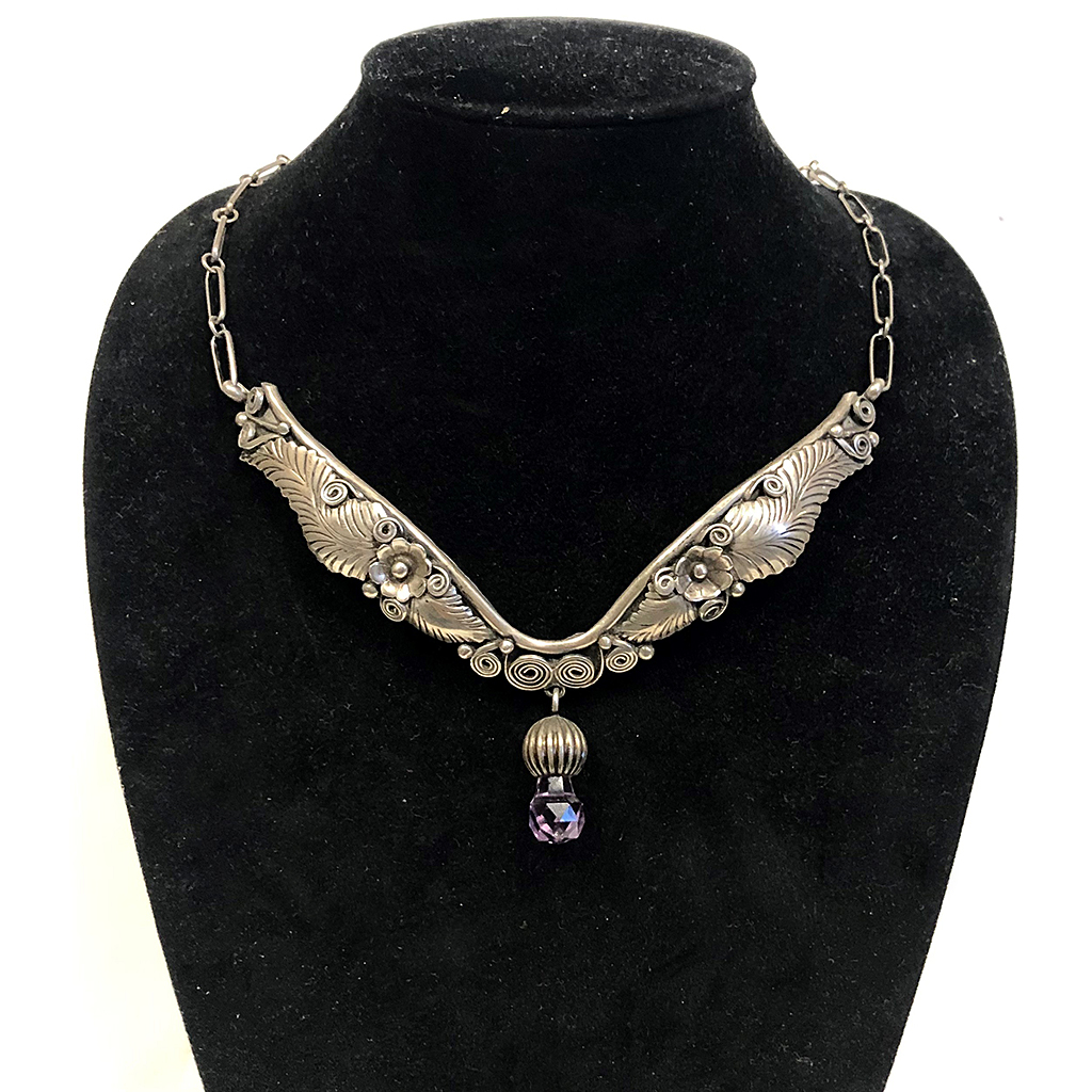 MID CENTURY M THOMAS STERLING SILVER CHAIN NECKALCE NAVAJO LEAF AND FLORAL DESIGN