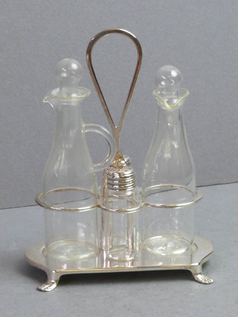 MINIATURE E.P. SILVER CONDIMENT SET WITH TWO GLASS BOTTLES AND TWO SALT POTS (X6)