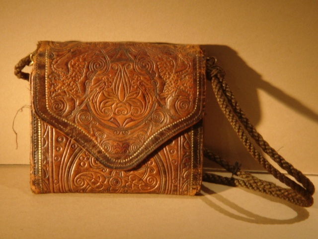MINIATURE EMBOSSED TAN LEATHER HANDBAG WITH CORD STRAP 12 CM WIDE