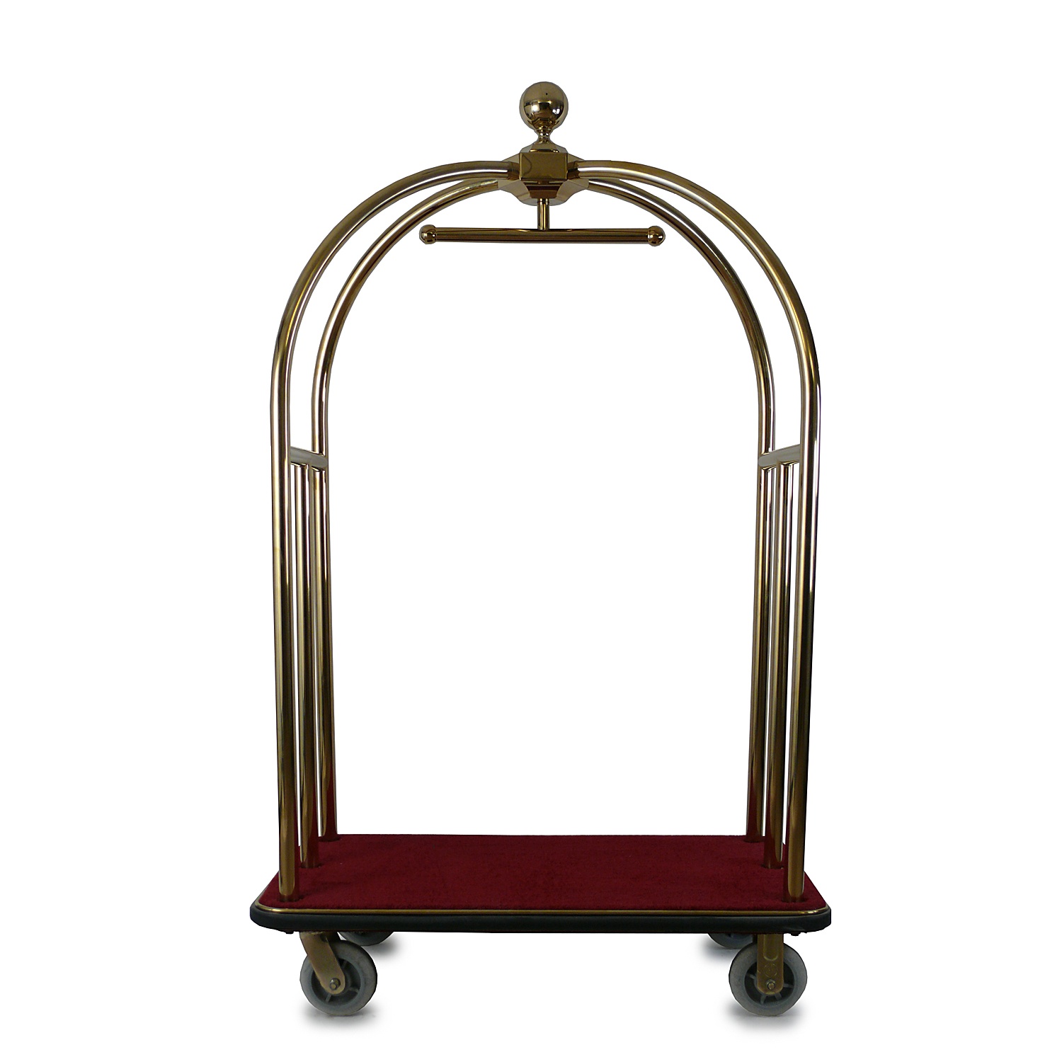 MODERN BRASS HOTEL LUGGAGE TROLLEY WITH RED CARPET BASE 188 CM HIGH 109 CM WIDE 86 CM DEEP (X2)
