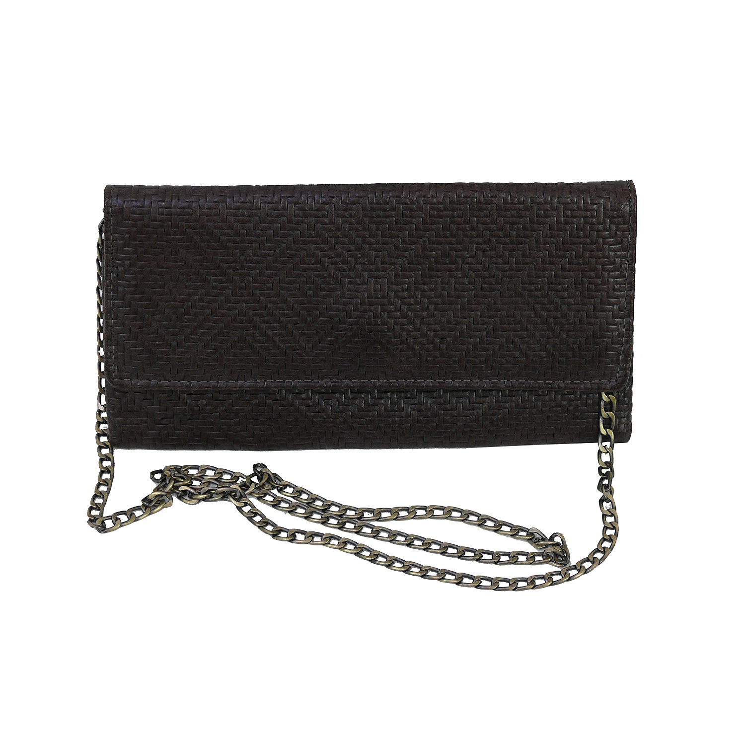 MODERN LEATHER WOVEN GEOMETRIC BROWN HANDBAG WITH LONG CHAIN STRAP AS LISTED