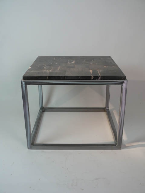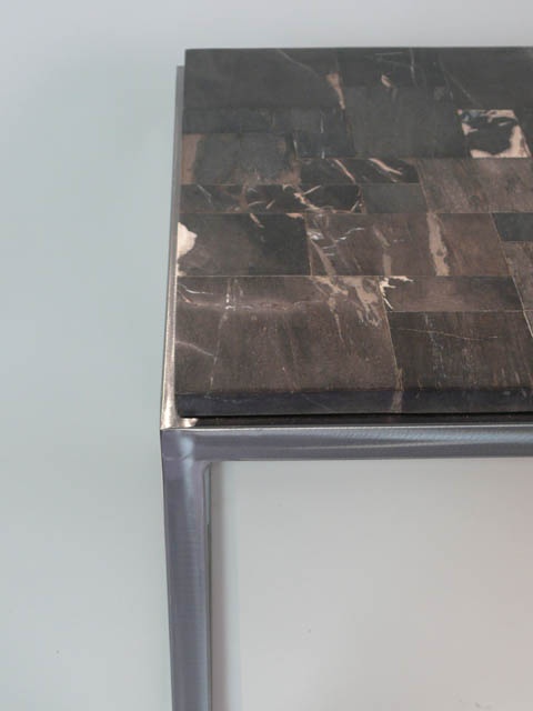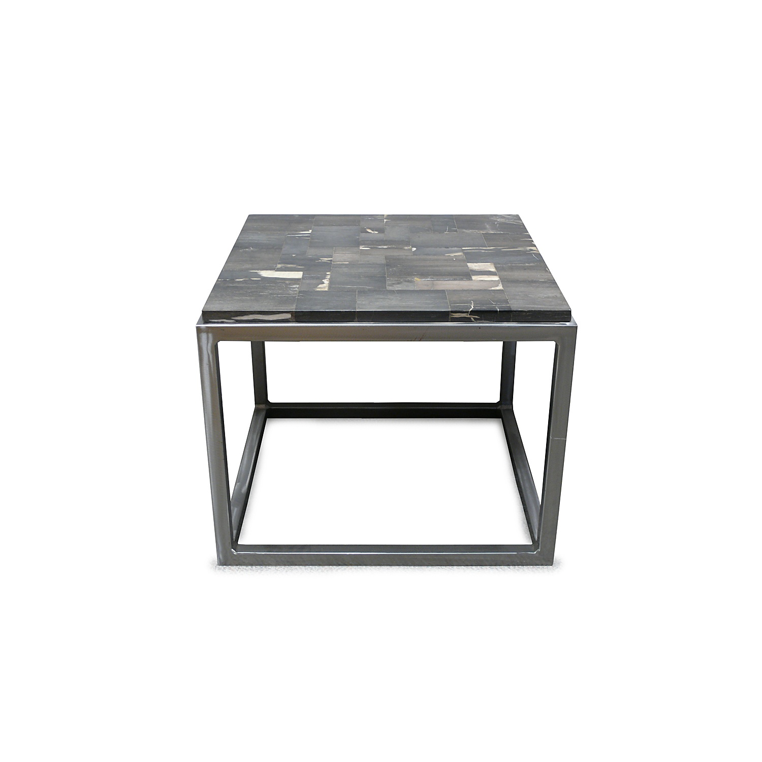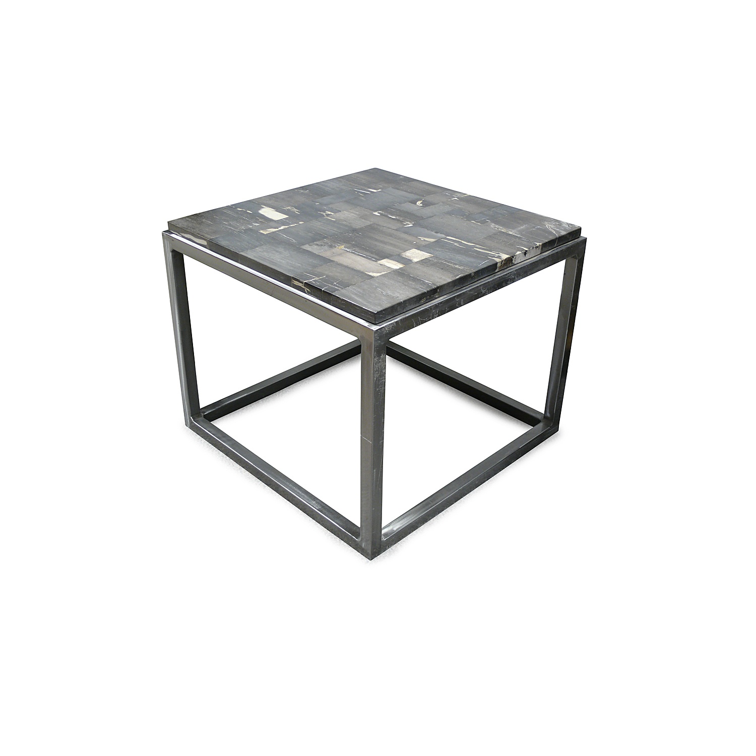 MODERN SQUARE LOW OCCASIONAL TABLE BRUSHED STEEL BASE WITH PETRIFIED WOOD BROWN MARBLE TOP 51 CM HIGH 62 CM WIDE (X2)